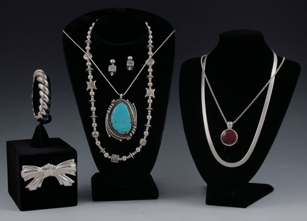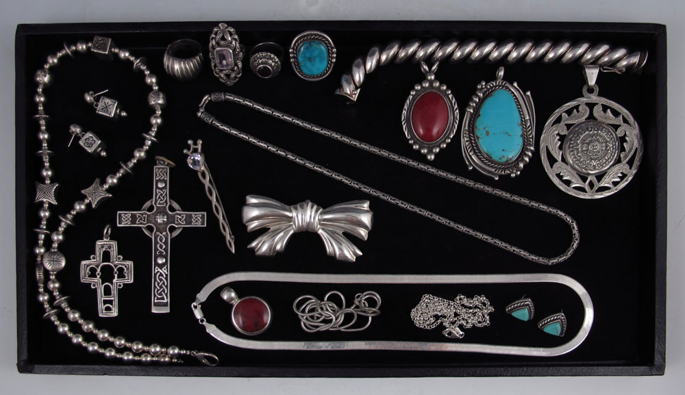 ESTATE LOT OF STERLING JEWELRY: Approx. 20 pieces to include, Italian link bracelet 7 1/2'', necklace and matching earrings, Mexican Bow brooch/pendant, Red Howlite, Turquoise, Purple heart staff pin marked Silver (missing one seed pearl), 4 chains of various links and lengths, rings - ribbed, marcasite with amethyst and garnet, turquoise, two crosses and a Mexican Indian pendant. 11.6 Troy oz inclusive. Sold as a lot.