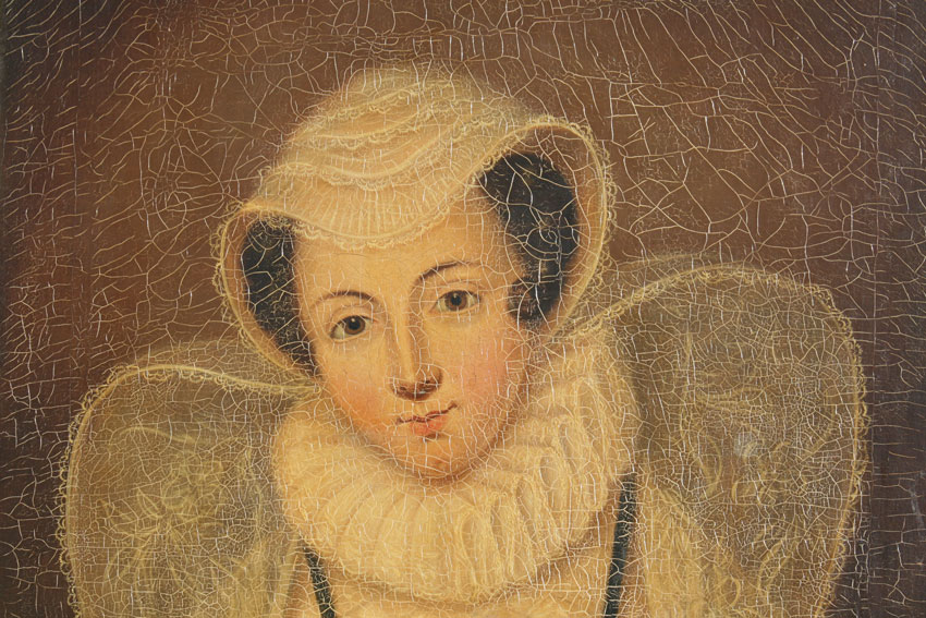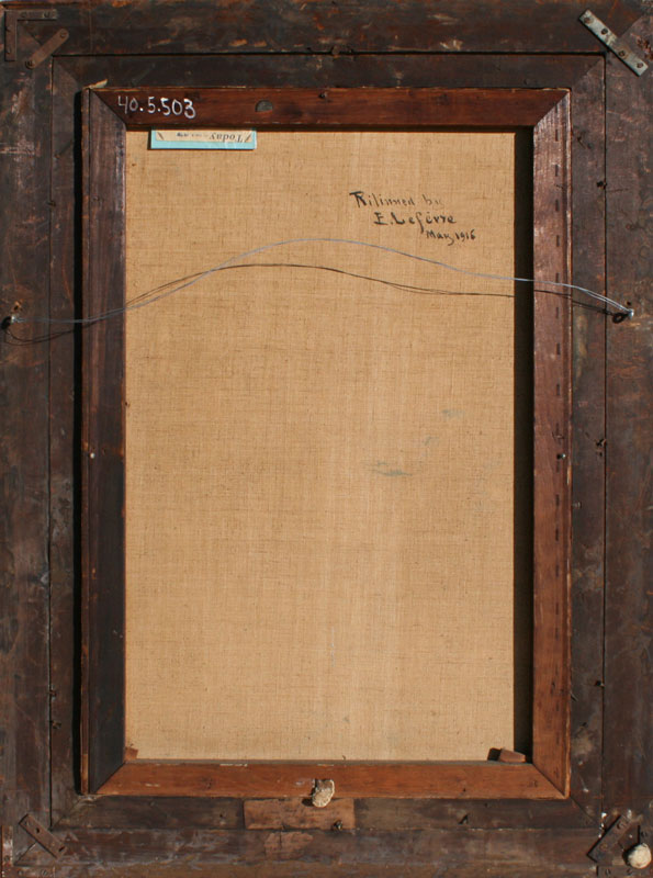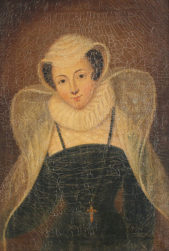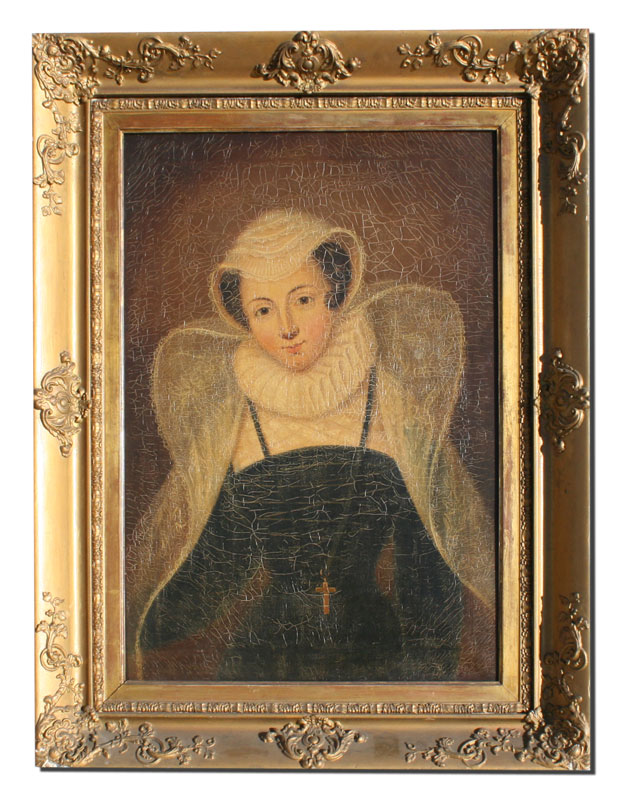 19TH CENTURY OIL/CANVAS OF MARY QUEEN OF SCOTS: 34'' x 23 1/4'', gilded gesso frame with overpaint, 43'' x 32'', partial label verso indicating that this was purchased at a nobleman's sale at Edenberg on January 1820, marking on canvas relined by E. Lefevere 1916.