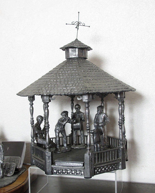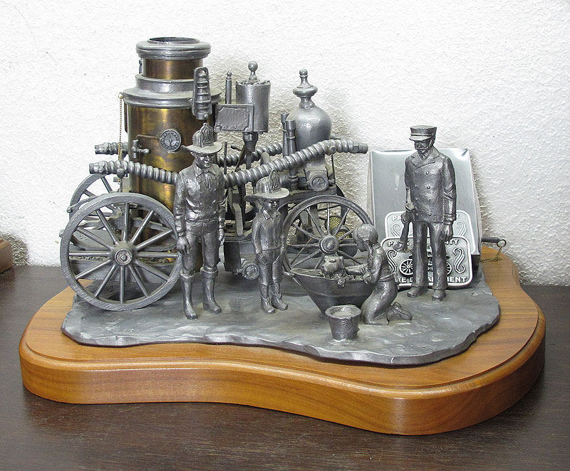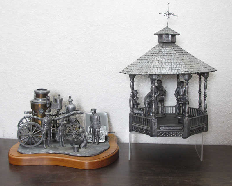 MICHAEL RICKER PEWTER GAZEBO & FIRE TRUCK: To include 1) Park City Gazebo with band figures, 18 1 /2'' h. x 14''. No COA. 2) ''Fire Engine Scene'' with figures, #35/500 COA, sold with 2 belt buckles with COA's. 10'' h. x 16'' x 14''.