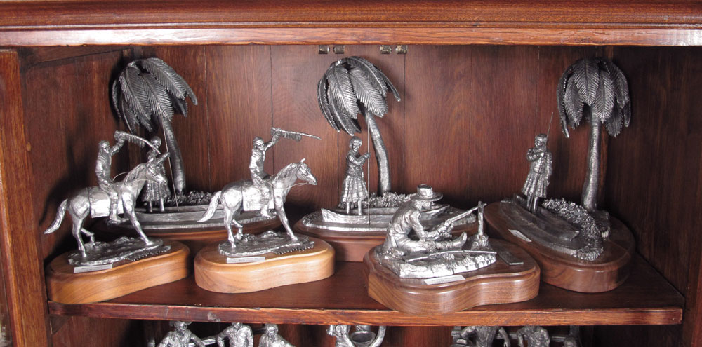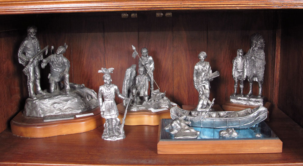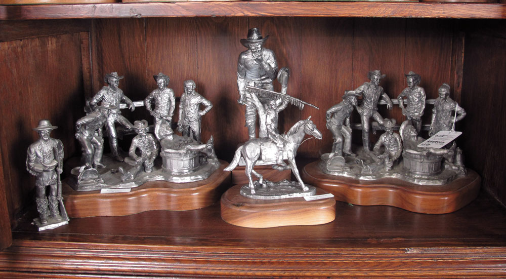 MICHAEL RICKER PEWTER COWBOYS & INDIANS FIGURINES: Approx 17 pieces to include 2 ''''Cowboy Collection'', 763 & 354 COA's, 7 3/4'' h. x 11 1/2'' x 10''; 3 ''Seminole Indians II'', 16,18,19 COA's; 3 ''Seminole Indian'' 19, 17, 125 COA's, note 2 broken spears; ''KC The Buffalo Hunter'', 451 COA, note barrel broken; ''Johnny Lee''; ''Barren Land''; ''Whats Left for my Children''; Indian with tablet; Frontier man with gun; ''Together a New Beginning'' 68 COA; ''Going Downstream'' 267 COA; Seminole Indian with gun.