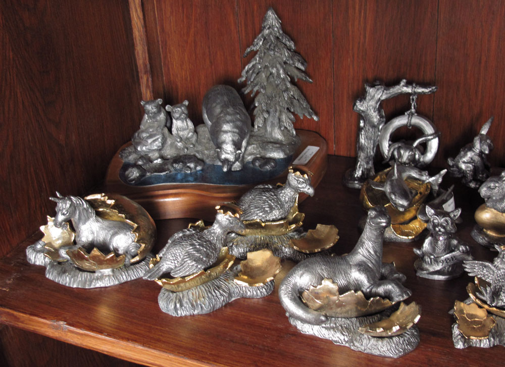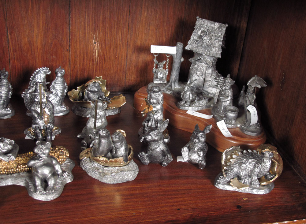 MICHAEL RICKER PEWTER ANIMAL PEWTER FIGURINES: Approx. 34 piece to include ''Esta'' 851 COA; Bears 442 COA, 6 1/2'' h. x 8 3/4'' x 6 1/2''; 2 ''Ted'' 4614, 4616; ''Dee'' 425 COA; Skiing Dragon 267; ''Gary, Landon & Logan'' 722 COA; ''Corky'' 604 COA; ''Michael, Nathaniel & Jessica'' 837 COA; ''Kathy'' 325 COA; ''Thea & Rise'' 427 COA; ''Heather & Heidi'' 1213 COA; ''Harvey'' 467 COA; ''Stephanie & Kelly'' 166 COA; ''Alyssa'' 299 COA; ''Stanley'' 355 COA; ''Sandy'' 5230 COA; 2 ''Kay & Greg'' one COA 519; ''Ducks Unlimited'' 122 COA; ''Joseph & Berley'' 477 COA; ''Gene'' 362 COA; ''Lisa & Breanna'' 146 COA; 3 ''Ambrose'' 532, 674, 675 COA's; ''Brayden'' 1681 COA, note missing stump; ''Dog Fishing'' 890 COA; ''Reggie'' 1217 COA; Manatees hatching 189; Alligator & Frog musicians; Dolphins; 86-87 Special Rabbits with shoe house; ''Ralph & Donna'' 879 COA