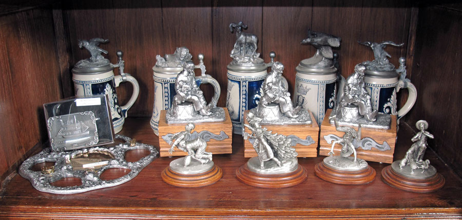 MICHAEL RICKER PEWTER MUSIC BOXES & STEINS: Approx. 10 pieces to include 3 ''Nate'' Music boxes, 2 have COA's 3149 & 3232; 1982 Stein lion lid 606 COA; 1985 Stein ducks lid 1925 COA, 8'' h. x 5 1/2''; 2 1983 Steins eagle lid 3 & 4 COA's; 1984 Stein Ram lid 1495 COA; Park City Queen buckle 1767 COA, Show Edition pond 179 COA. Also included with lot are 4 Gorham pewter Norman Rockwell figurines.