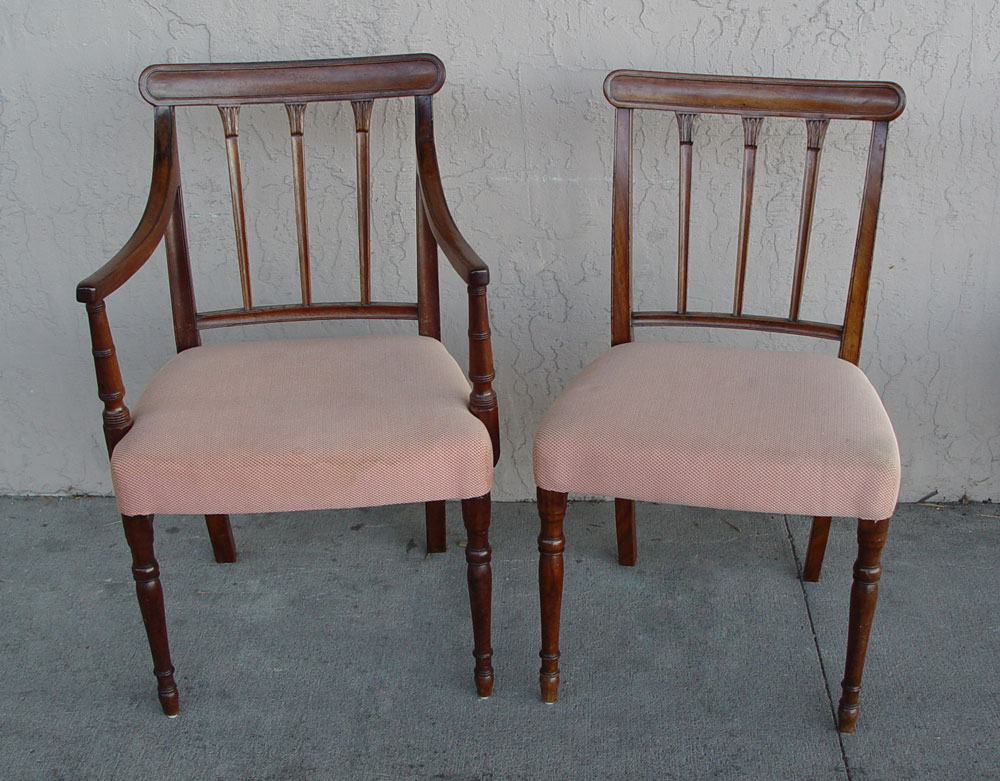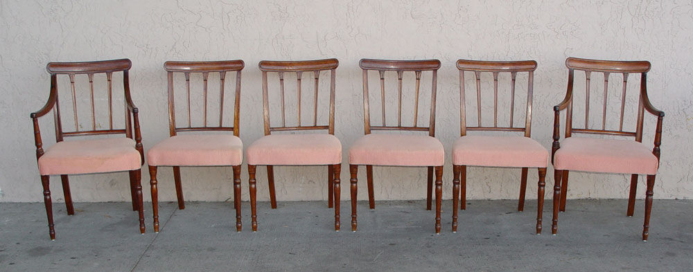 6 ENGLISH REGENCY DINING CHAIRS: Suite of Six English Regency Period matching Dining Chairs including two arm and four side chairs; all with over the rail later upholstery. Arm chairs measure 35 1/2' X 23'' X 18''.