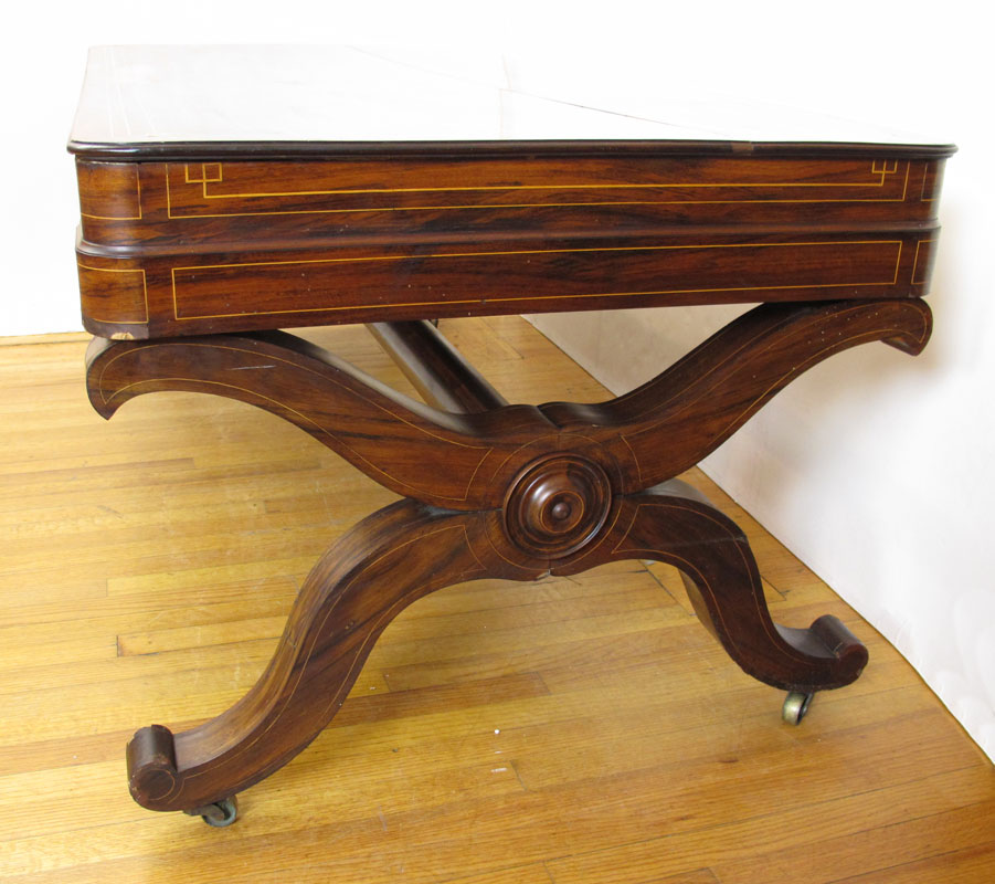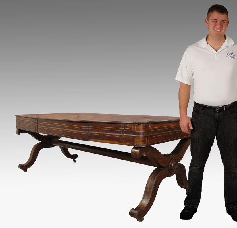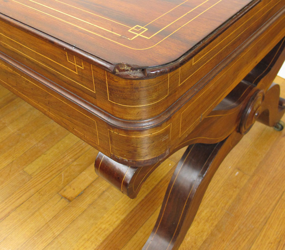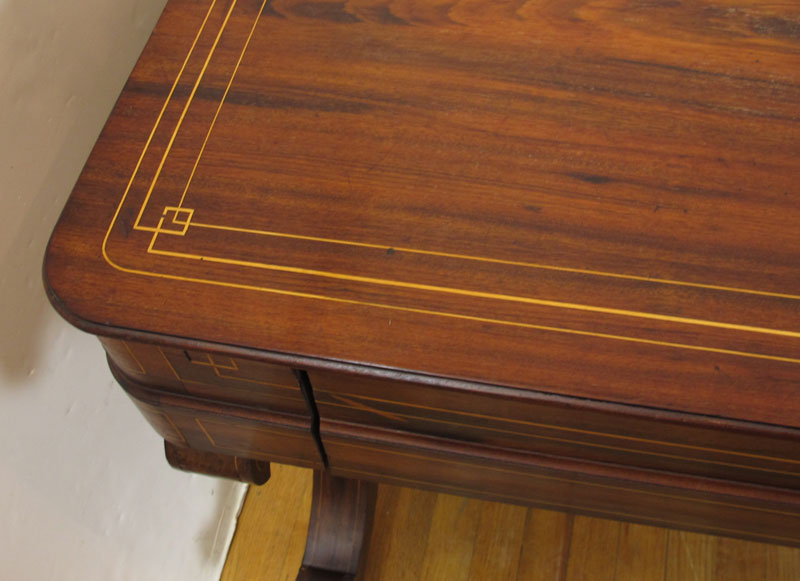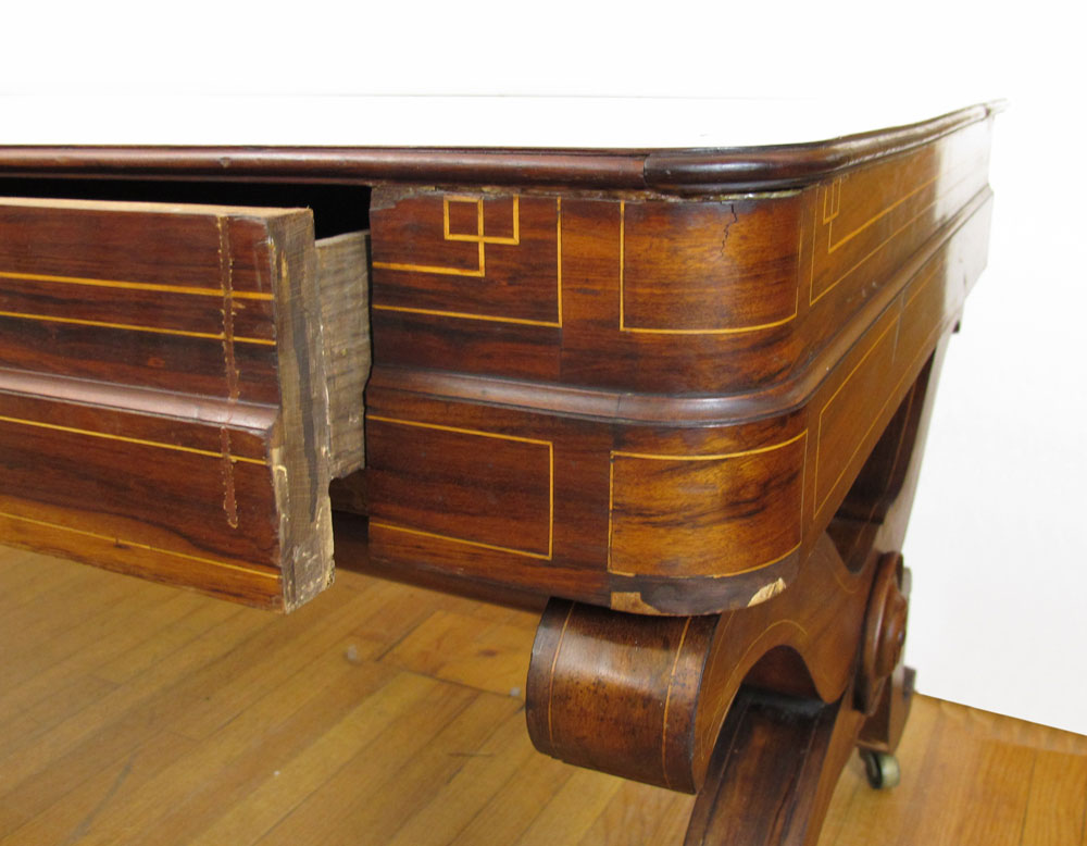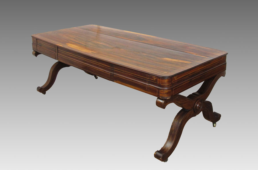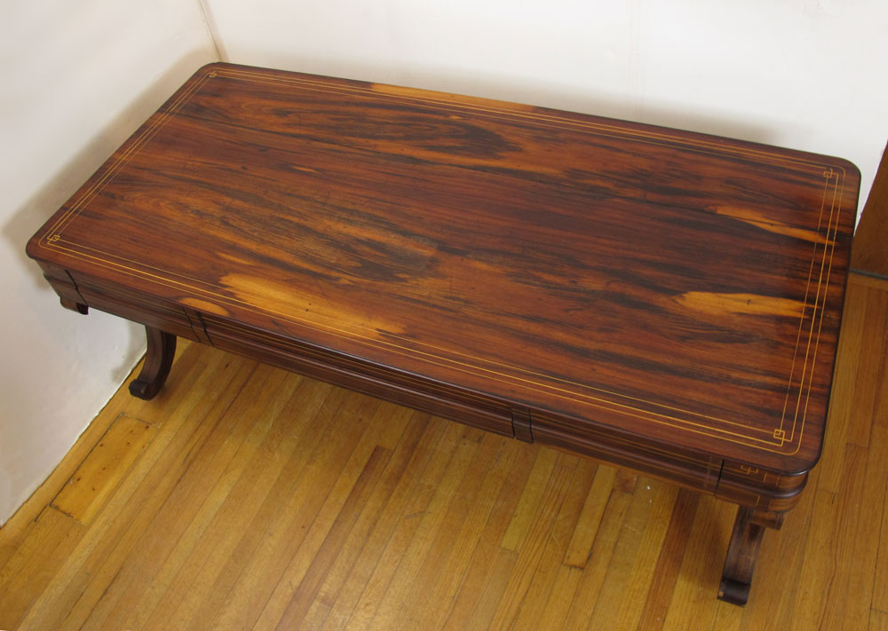 ROSEWOOD DESK / TABLE: String inlay in a richly grained wood, 3 drawers, tubular stretcher across the length. 28 3/4'' h. x 77'' x 35''.