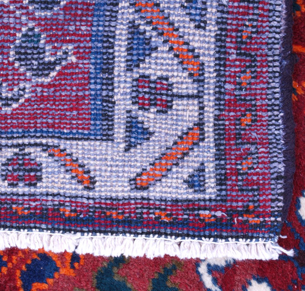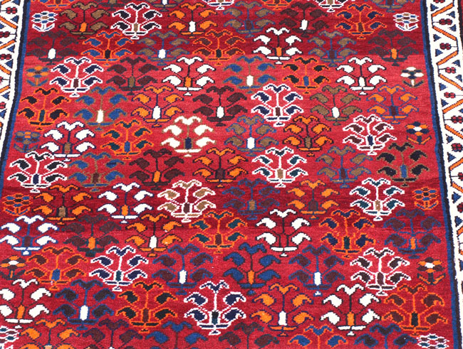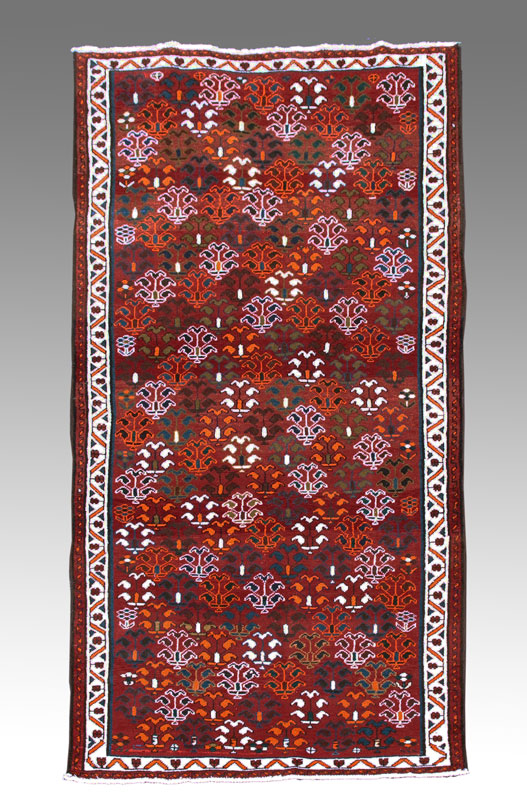 PERSIAN BAHKTIARI HAND KNOTTED WOOL RUG, Approx. 9' 1'' x 4' 8'': This modern tribal piece has a field of repeating small vase of flowers designs in staggered rows covering the whole surface of the rug except for the white main border and its two rust/blue guard borders. The field's colors are also shades of rust orange-red, blue, and white.