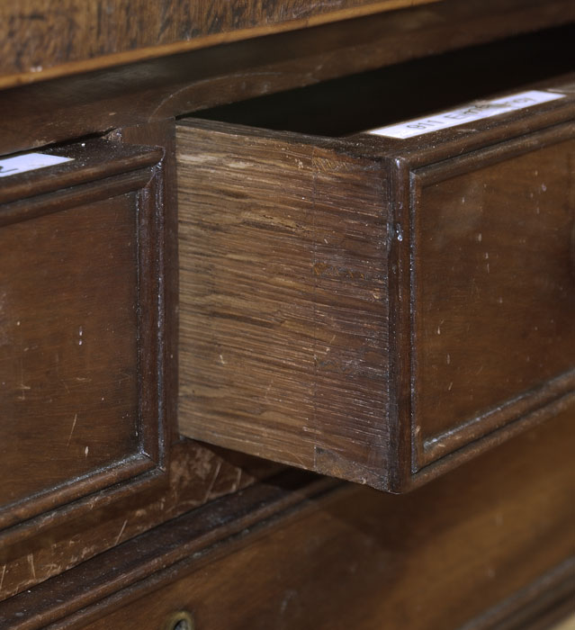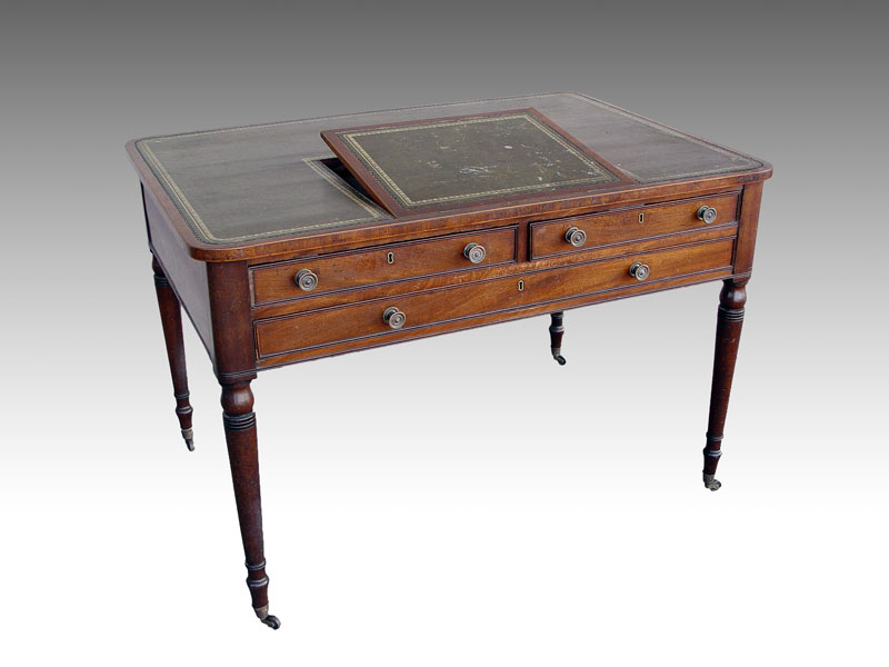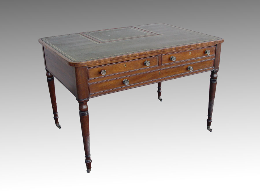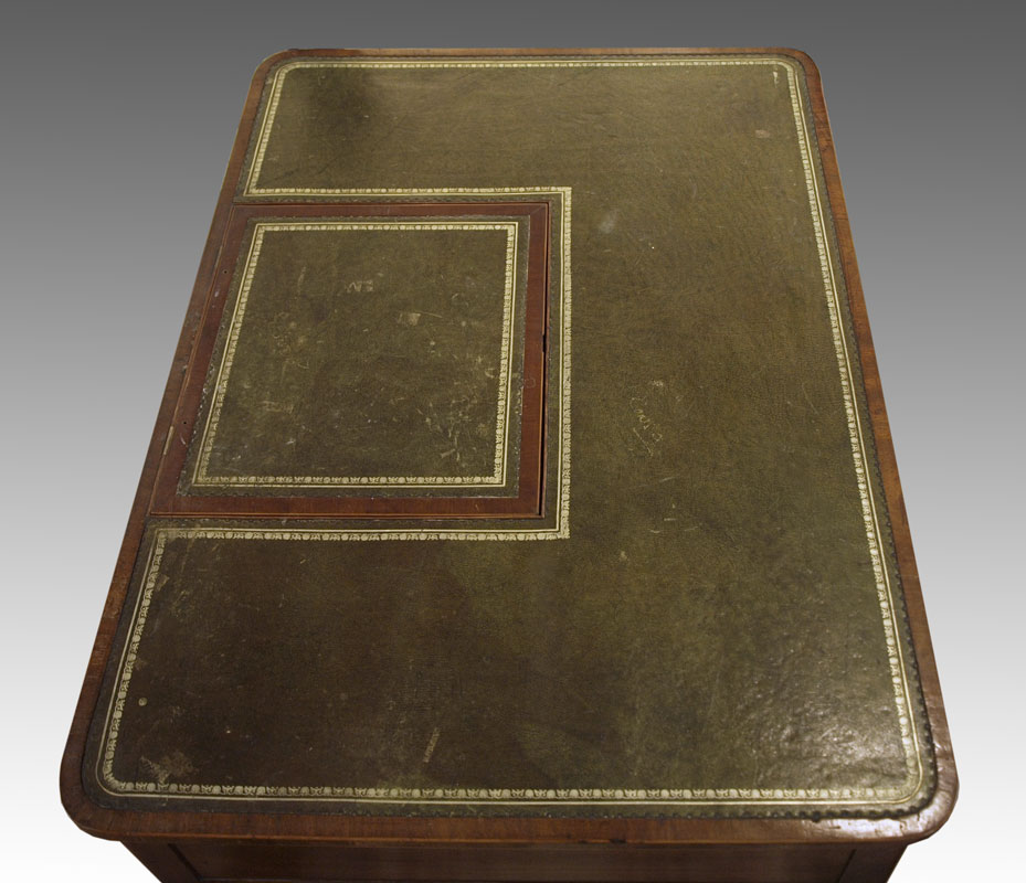 1850's ENGLISH LEATHER TOP DESK: English partner's desk with gilded edge, Florentine style leather top has a document well. Turned legs with original brass casters. Approx. 30'' x 31'' 3/4'' x 45 1/4'' inches overall.