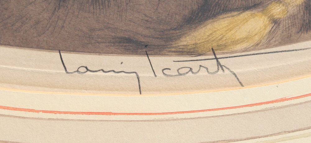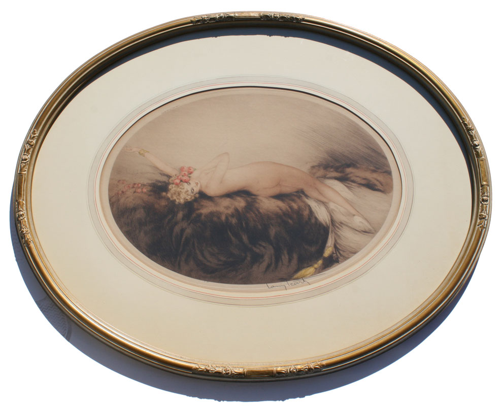 LOUIS ICART COLORED ETCHING TITLED 'VENUS': depicts a reclining blonde female nude, sight size 14 1/2'' x 20'', pencil signed, Paris windmill blindstamp lower left, carved and gilded frame, 25 1/2'' x 32''.