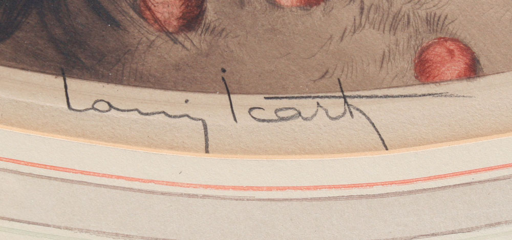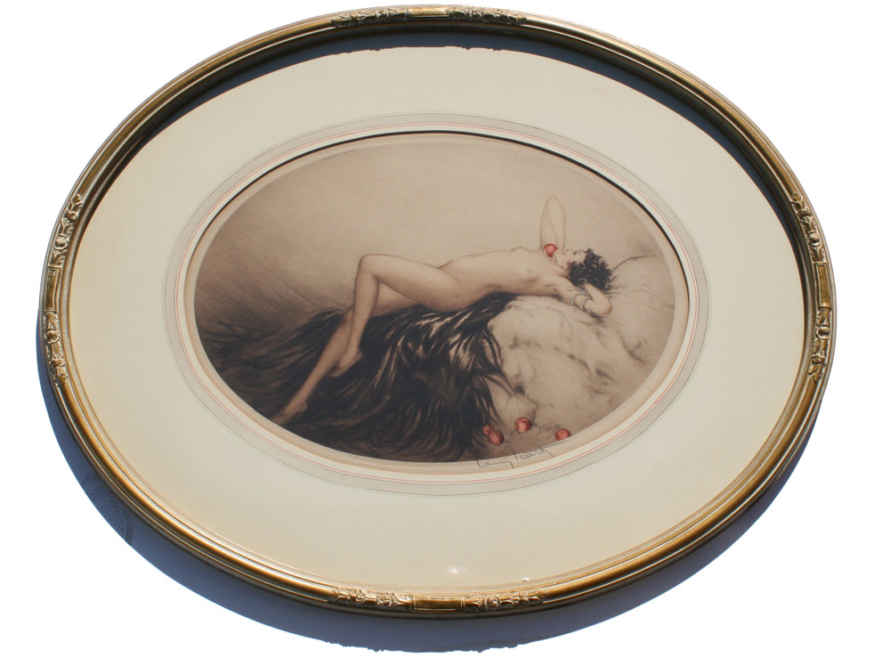 LOUIS ICART COLORED ETCHING, 'EVE': sight size 14'' x 20'', pencil signed, Paris windmill mark lower left, published in 1928, carved and gilded oval frame, 25'' x 32''.