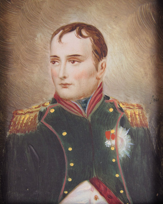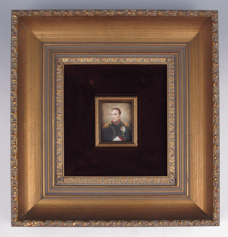 MINIATURE PAINTING ON COPPER OF NAPOLEON: 2 3/4'' x 2 1/4'', illegible signature by his right shoulder, contemporary framing, 12 1/2'' x 12''.