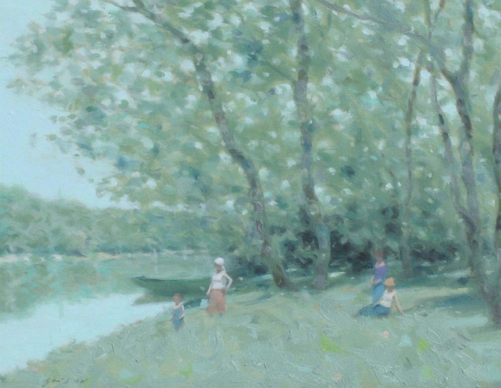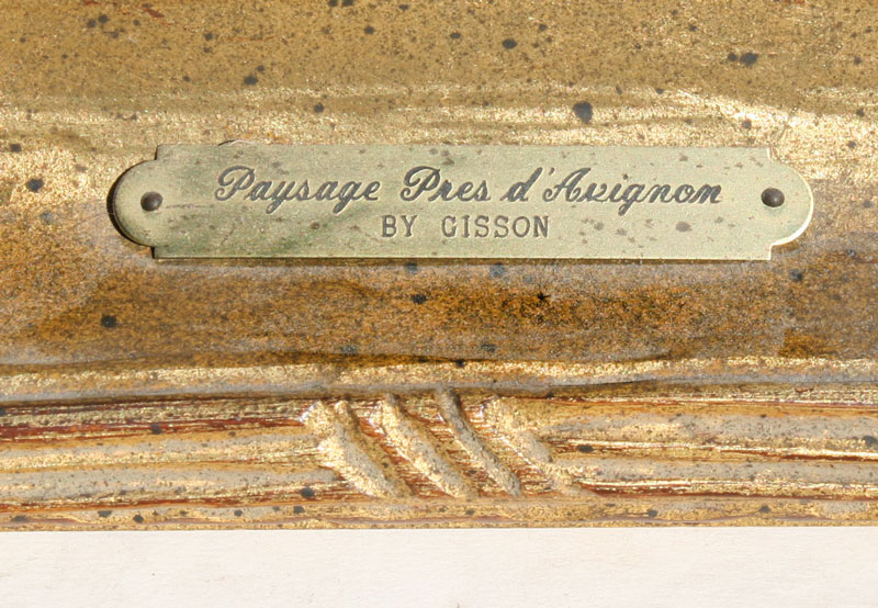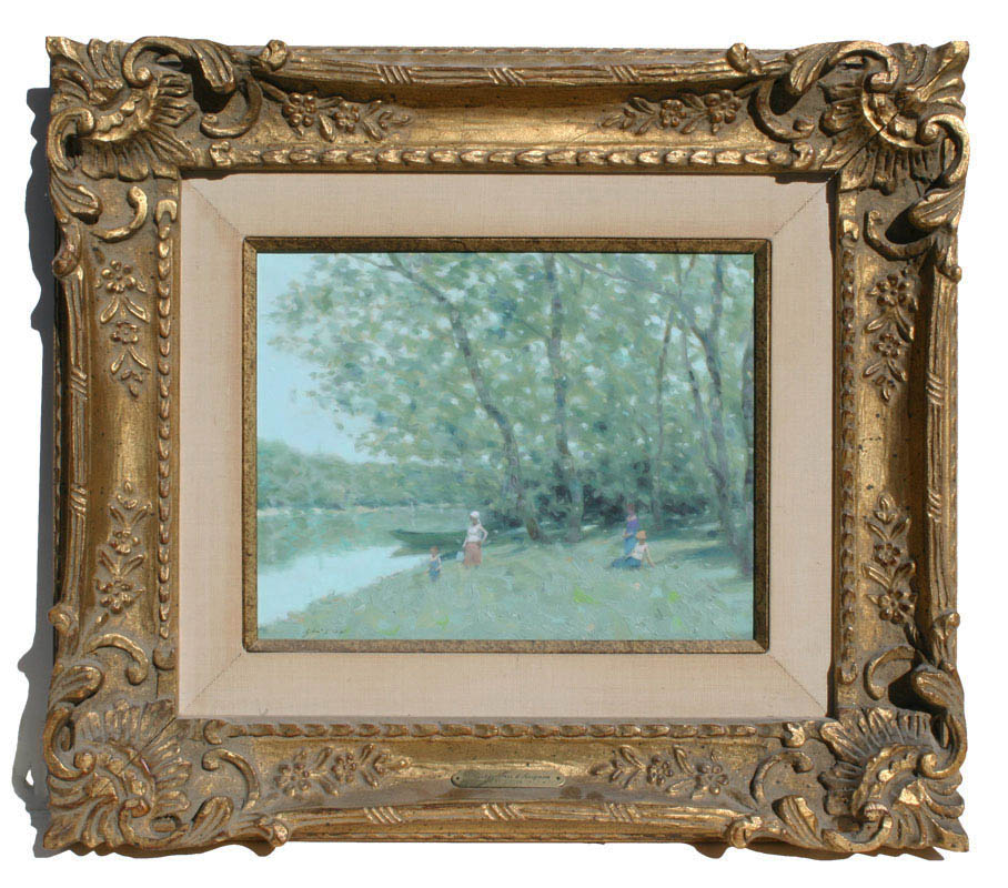 GISSON, Andre, (French/American, 1921-2003): 'Paysage Preis D' Avignon', Depicts Figures on a Riverbank, OIL/Canvas, 11'' x 14'', encased in elaborate original pierce carved and gilded frame, 21 1/2'' x 24 1/2''.