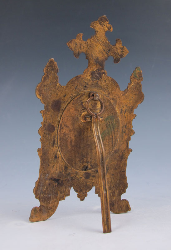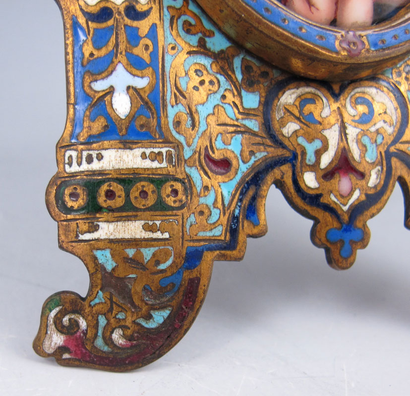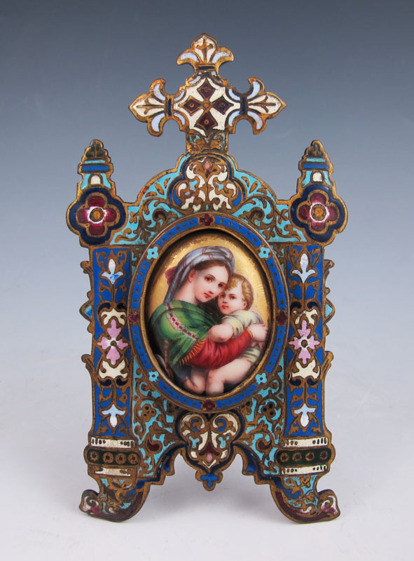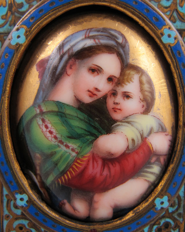 MINIATURE PORCELAIN PAINTING OF MADONNA AND CHILD IN CHAMPLEVE FRAME: 1 3/4'' x 1 1/2'', frame is 5 1/2'' x 3'', age unknown.