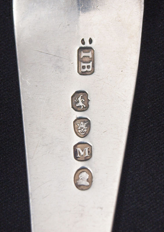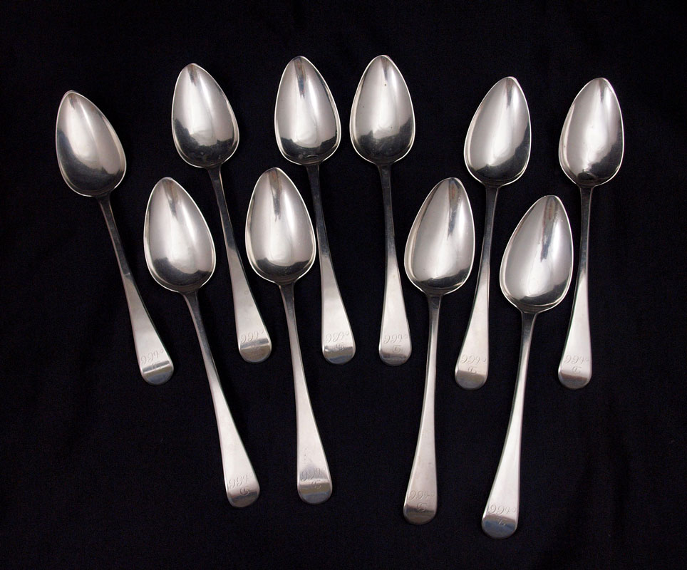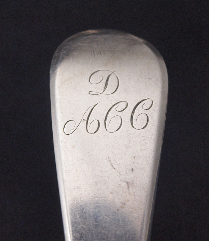 SET OF 10 1807 ENGLISH STERLING SPOONS: Hallmarked 1807 London with maker John Blake, John Bunn or John Blades (all used very similar hallmarks), set of 10 tablespoons (8 5/8''). All monogrammed D over ACC. Approx. 16.8 troy oz.