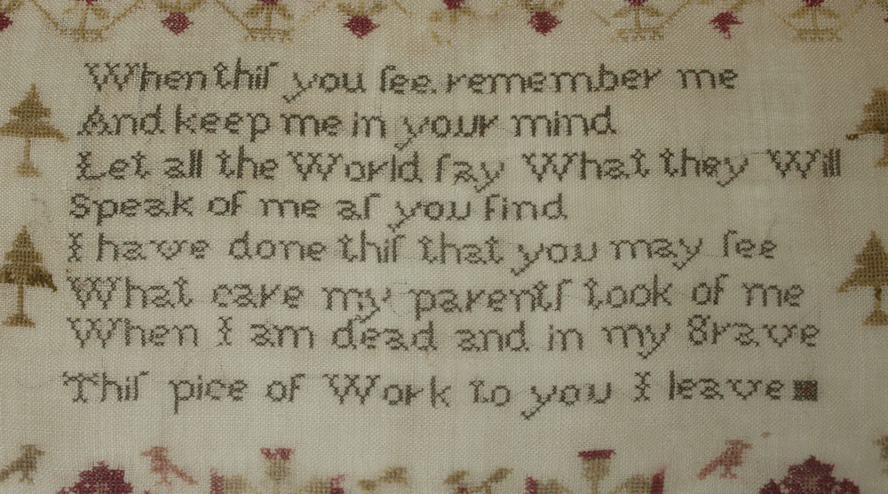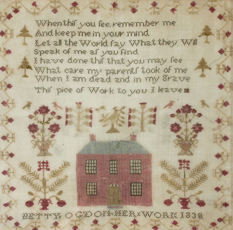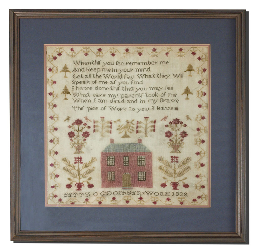 HAND STITCHED SAMPLER BY BETTY OGDON 1838: Motto sampler with house, birds, trees and a flower border. ''When this you see, remember me And keep me in your mind Let all the World say What they Will Speak of me as you find I have done this that you may see What care my parents took of me When I am dead and in my grave This pice of Work to you I leave BETTY OGDON HER WORK 1838''. Framed under glass with in later frame and mats. Image approx. 16'' x 16''. Frame 23'' x 23 1/2''.