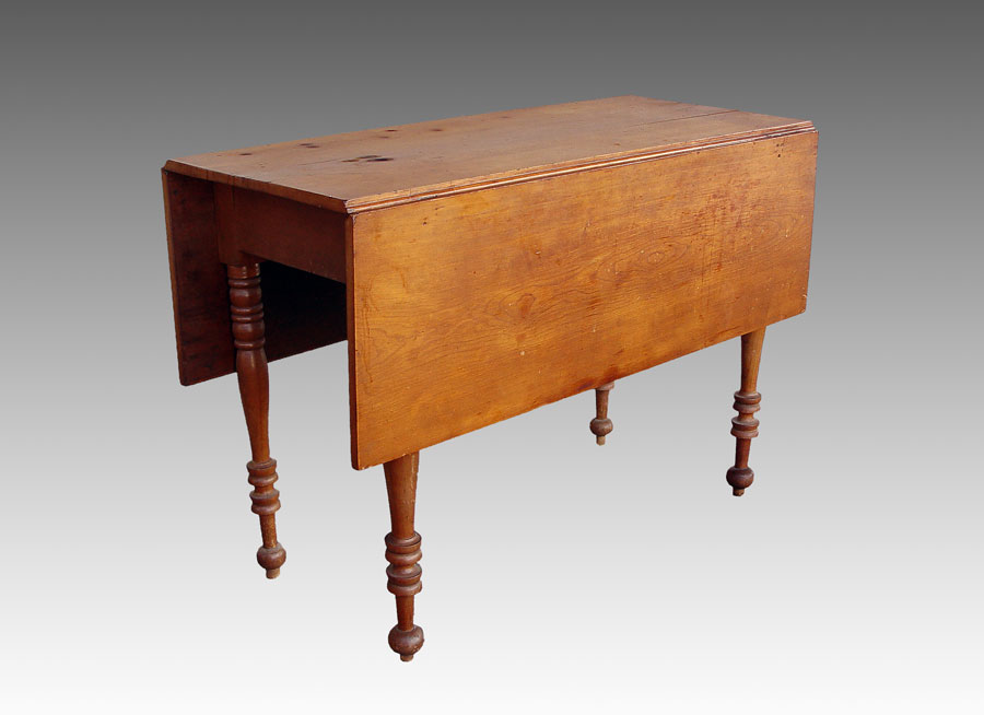 AMERICAN COUNTRY CHERRY DROP LEAF TABLE: American, Cherry drop leaf dining table with round tapered legs terminating in beehive feet. Approx. 29'' x 17 1/4'' x 13 3/4 drop leaf; inches overall.