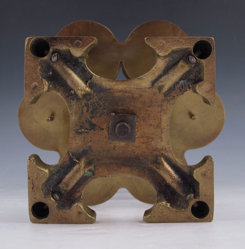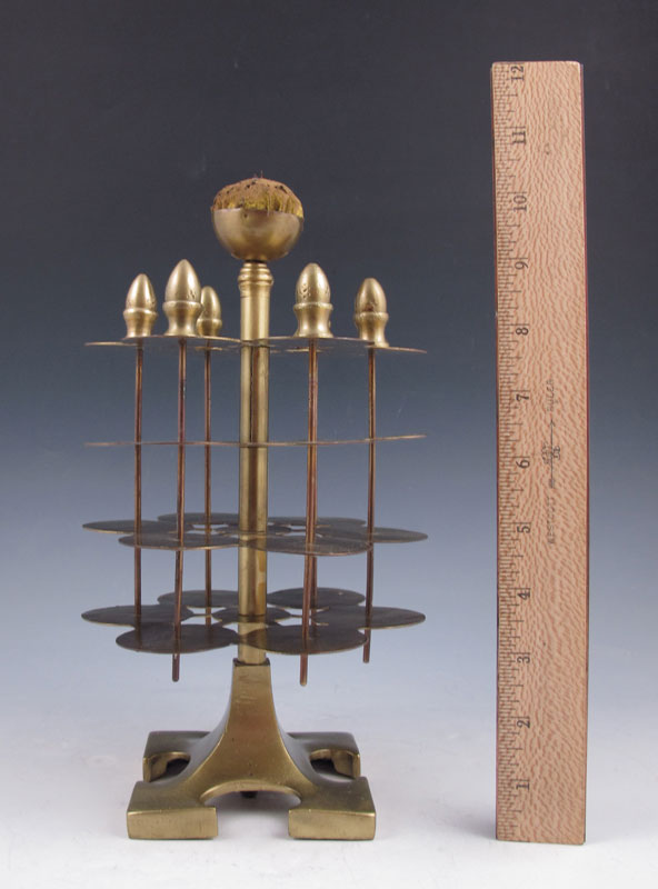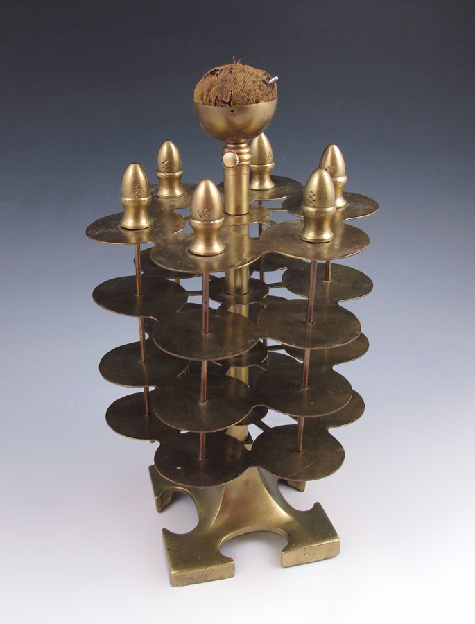 BRASS REEL STAND: Three tier revolving thread spool holder with pin cushion at the top center, 11'' tall, 6'' dia.