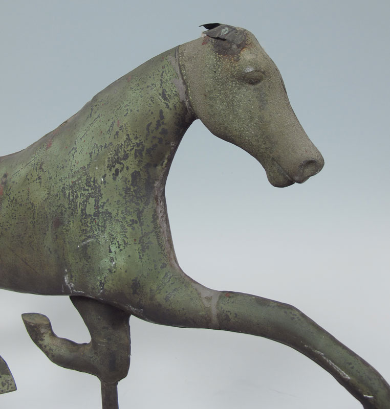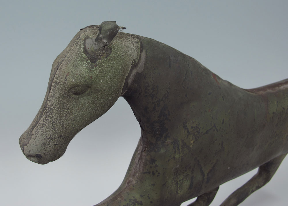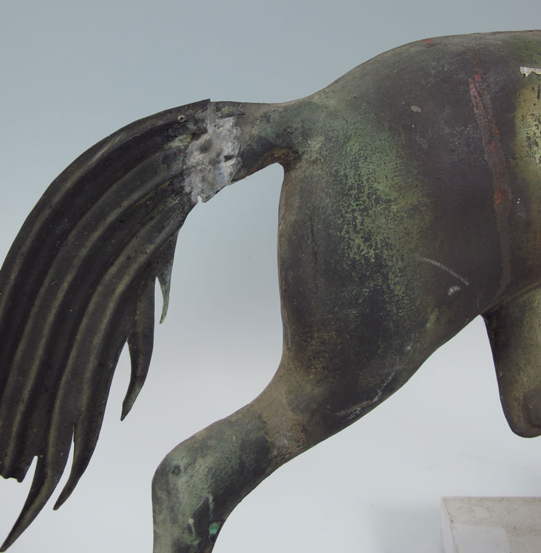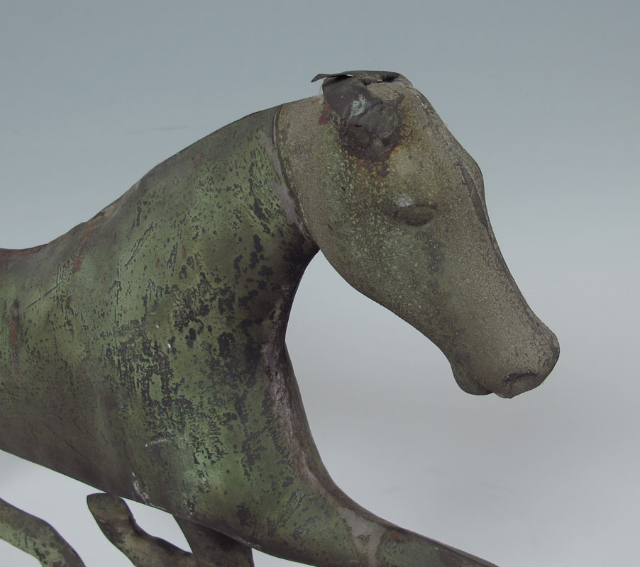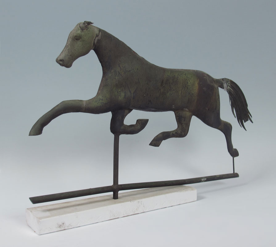 EARLY 19TH C HORSE WEATHER VANE: Antique American lead weather vane modeled as a trotting horse Dimensions approx. 17 x 26 1/2'' overall.
