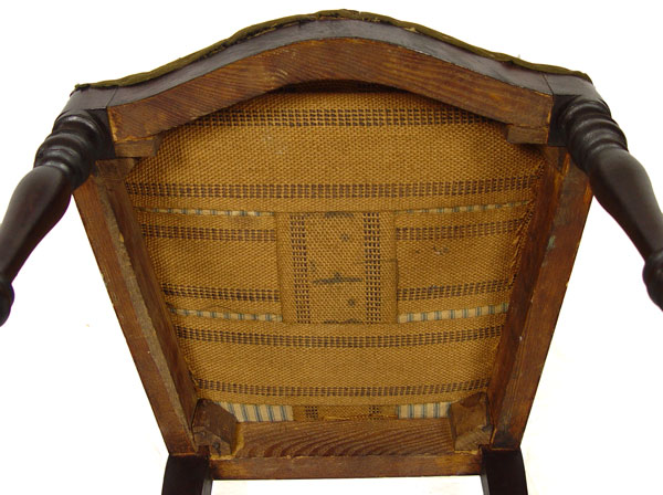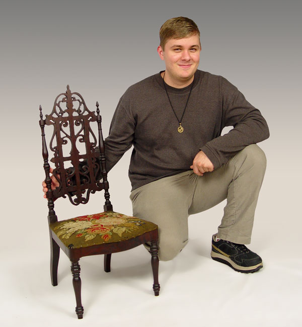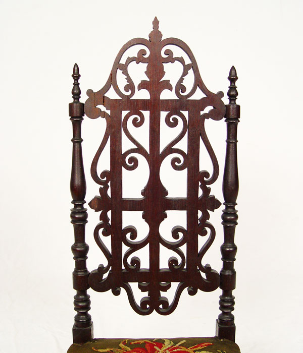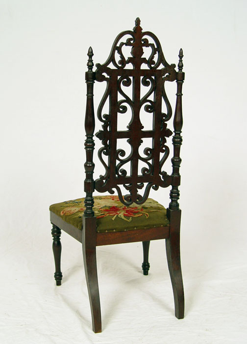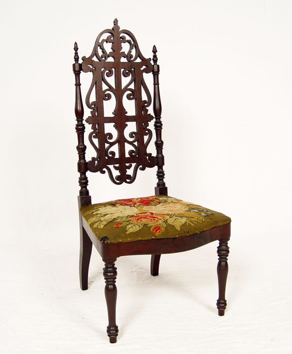 RARE WALNUT GOTHIC CHILDS CHAIR: Straight back with turned sides supporting open cut fret work cresting back and chest. Turned front legs supporting upholstered seat covered in finely wove needlepoint of floral design. 15'' wide, 15'' deep, 34 1/2'' tall