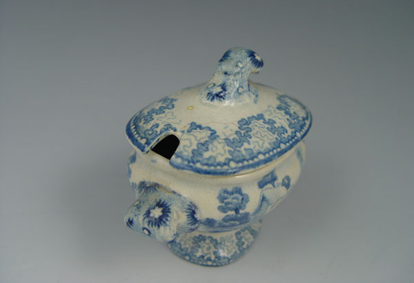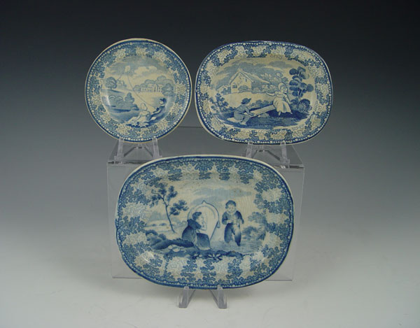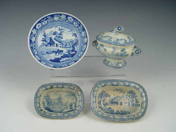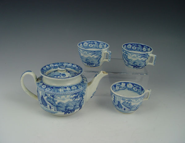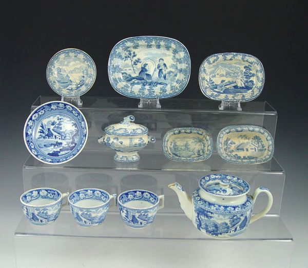 ACCUMULATED GROUP CHILDS TRANSFERWARE: Includes 6 pieces of Brameld early 19th C, a tureen, 2 platters, a plate and 2 open vegetables. The larger platter is 5 1/4''l, the tureen 2 3/4'' tall. The teapot, 3 cups and saucers are of a different pattern.