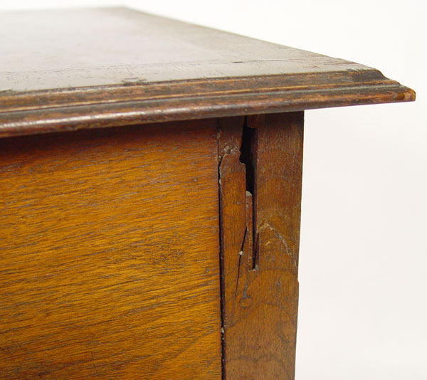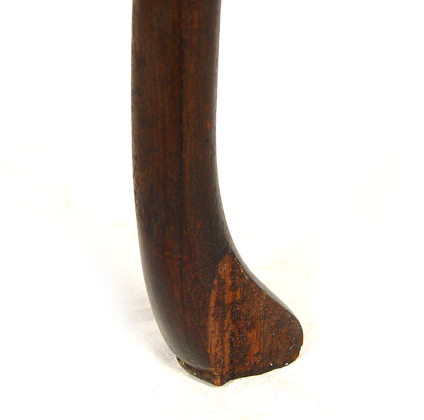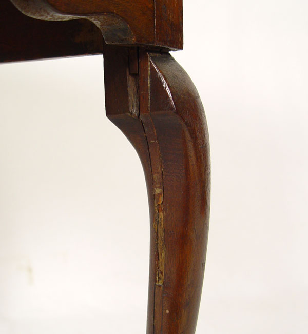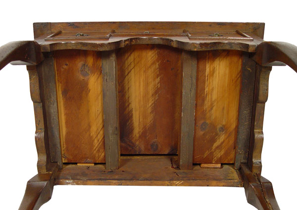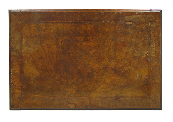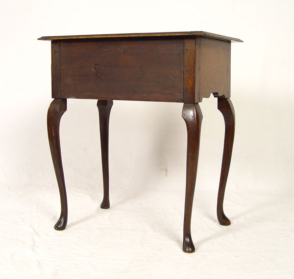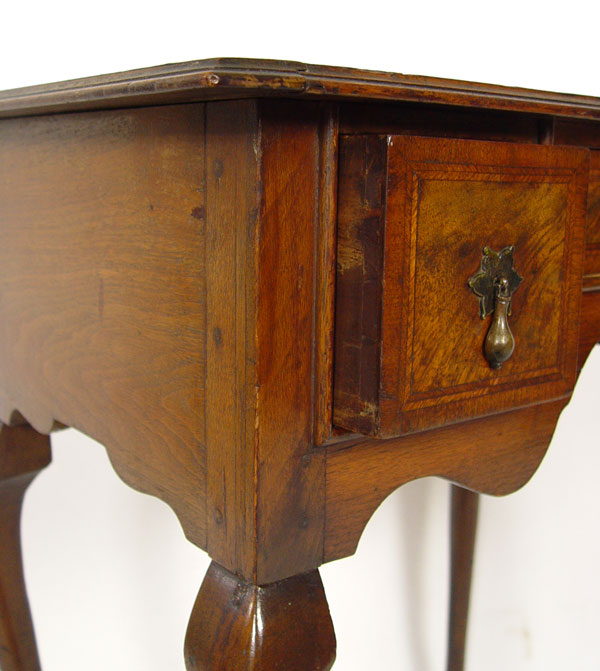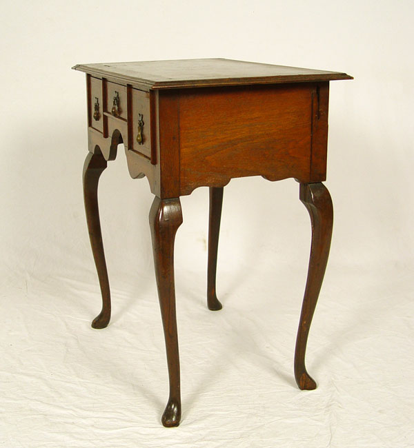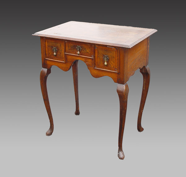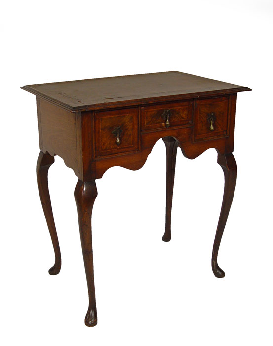 PERIOD QUEEN ANNE ENGLISH LOWBOY: Butterfly burl veneer top and three drawer fronts, original brass baroque hardware. Queen Anne legs with pad foot. 30'' h x 27'' x 18''