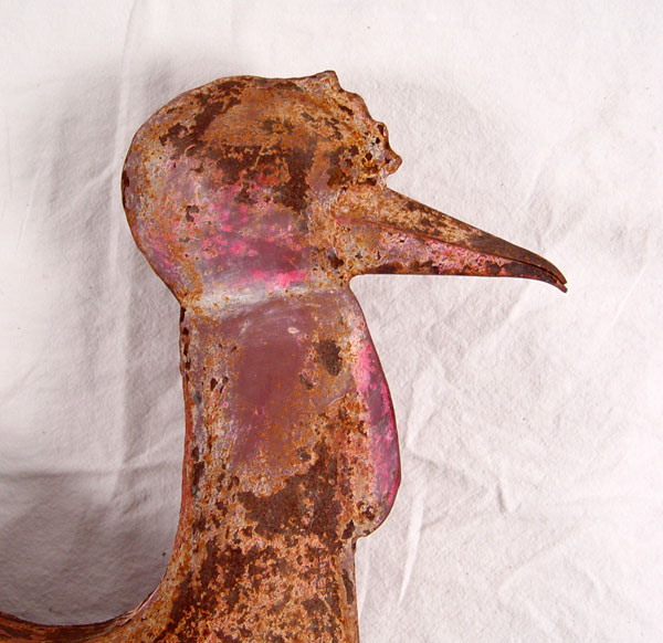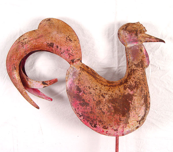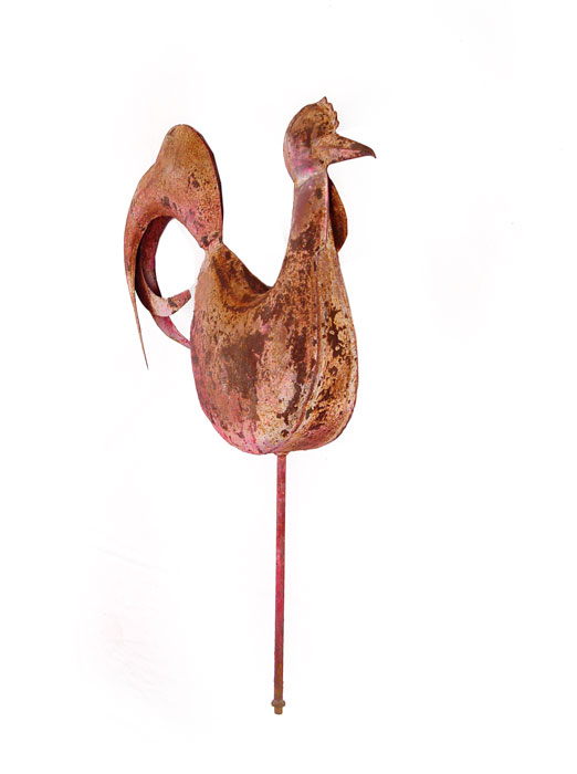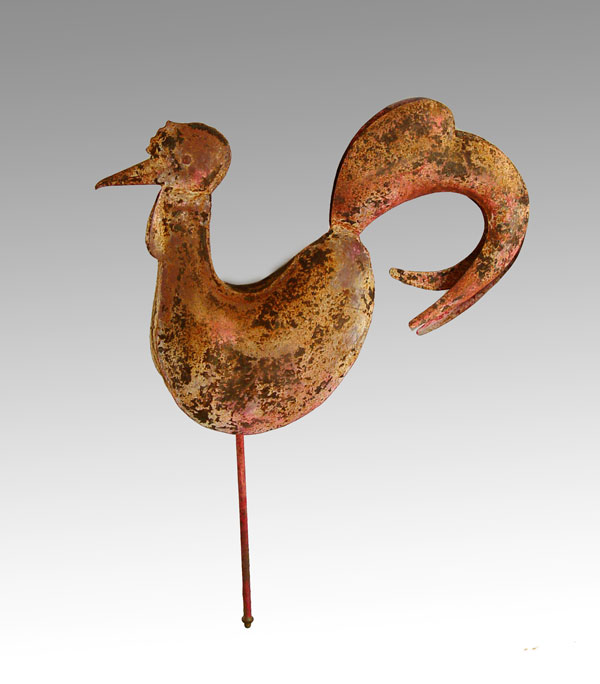 VINTAGE ROOSTER FORM WEATHER VANE: Circa Mid 20th century, retains some original paint. Hollow body. Rooster measures 21 1/2'' h. x 24'' x 4'', 35'' h overall.