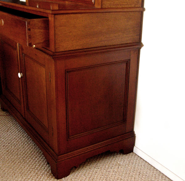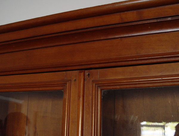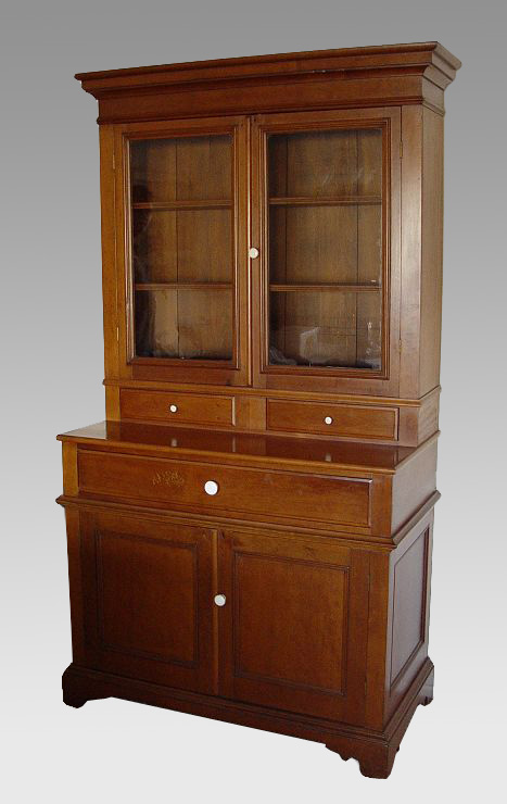 AMERICAN COUNTRY CHERRY STEPBACK CUPBOARD: Two part with the top having glass lockable doors, interior of 2 adjustable shelves, over 2 drawers with porcelain knobs. Base cabinet has one full length drawer over 2 lockable doors also with porcelain knobs. Cut bracket base and molded panels. Key available in office. 44'' wide, 22'' deep, 82'' tall.