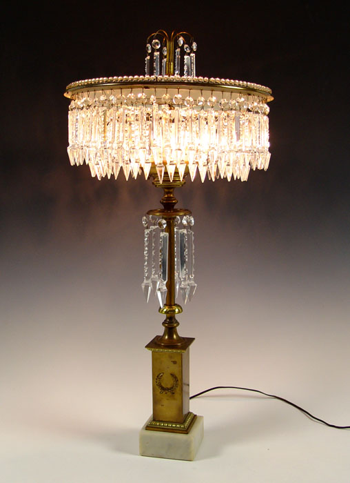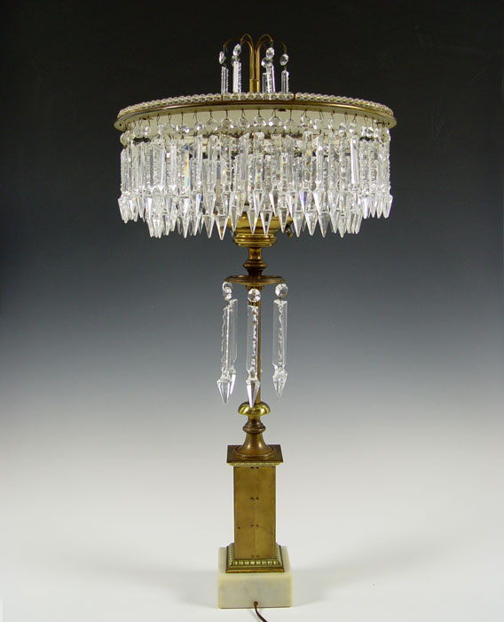 BRASS AND CRYSTAL TABLE TOP CHANDELIER LAMP: Circular tiers of faceted prisms. Marble plinth. Four light, three way sockets. 33'' tall.