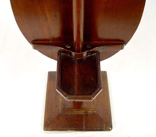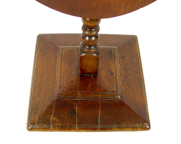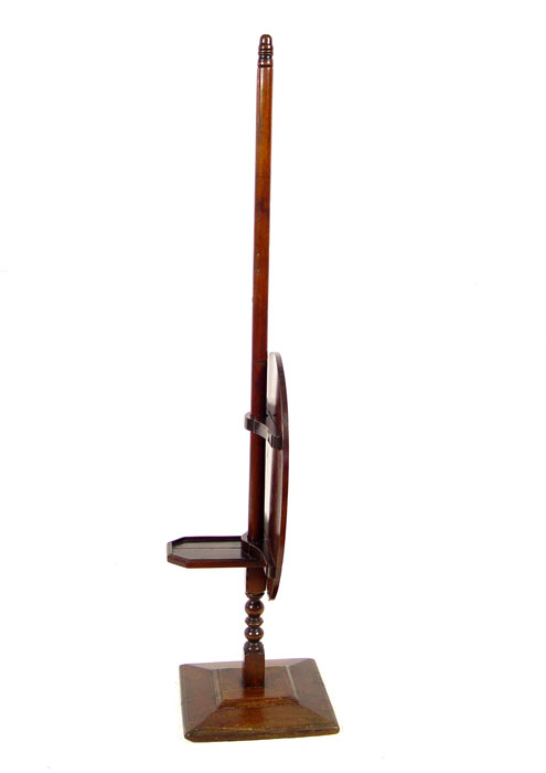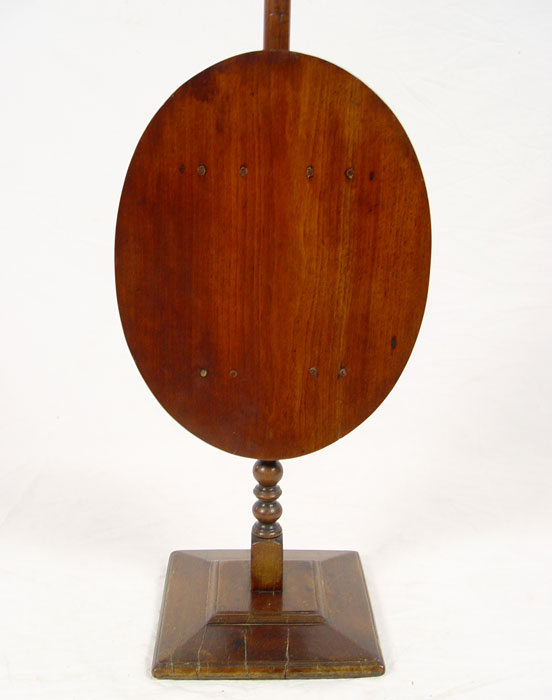18TH C ENGLISH WALNUT POLE SCREEN CANDLE STAND: Finely turned central support with holes for height adjustment. Oval screen backed with shelf to hold candle stick. Pegged construction, good patina. 50 1/2'' tall x 14 x 11 1/2''.
