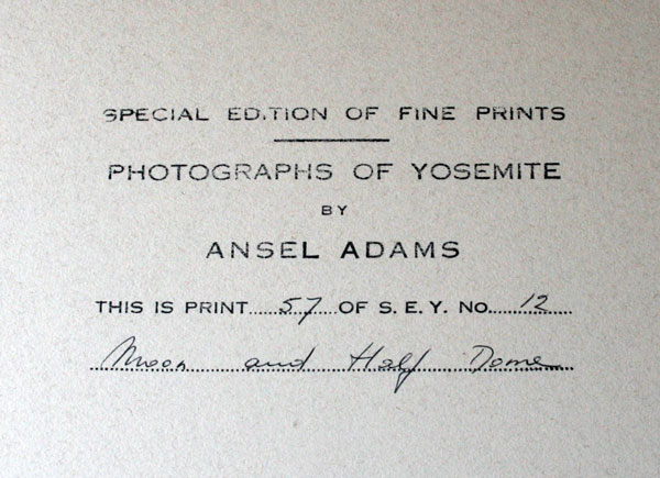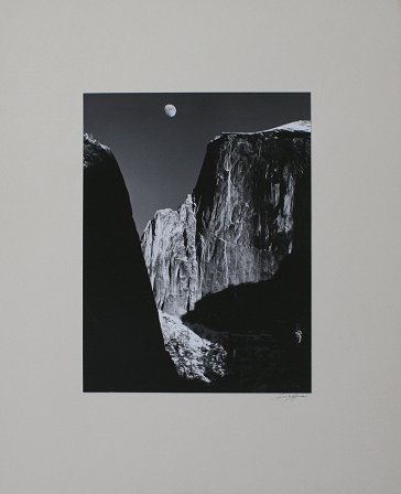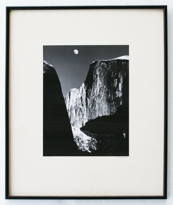 ADAMS, Ansel Easton, (American, 1902-1984): ''Moon and Half-Dome'' Silver Gelatin, 9 5/8'' x 7 3/8'', mounted, signed by the photographer in ink on the mount, the Special Edition of Fine Prints (S.E.Y.), Photographs of Yosemite, 57 in the series number 12, (Yosemite and the Range of Light, pl. 115; Yosemite: Ansel Adams, pl. 55; Classic Images, cover and pl. 74; Examples, p. 132), black painted frame, 17'' x 14''.