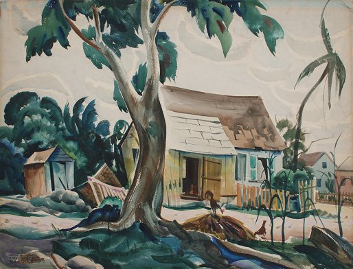 JICHA, Joseph, (American, 1901-): ''Rural Nassau, Bahamas, '28'', W/C, 17 3/4'' x 23 3/4'', signed, unframed. Jicha was a member of Cleveland's notorious ''Kokoon Club'', an artist's group famous for it's outrageous parties and it's important American modernist/avant garde members.