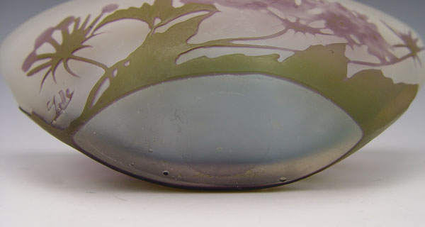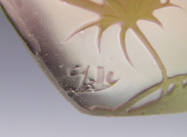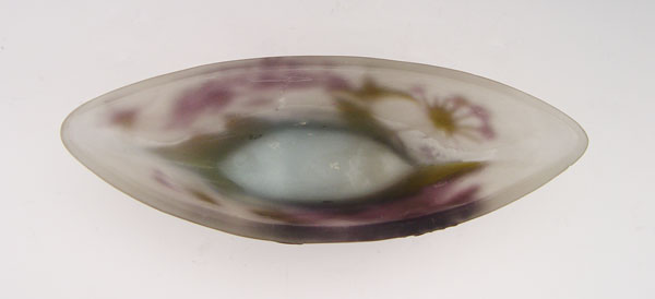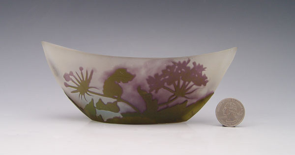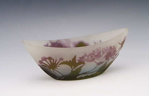 GALLE CAMEO GLASS IN BOAT FORM: Green cut to lavender, 6 3/4'' long, 2 3/4'' high.