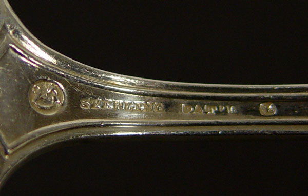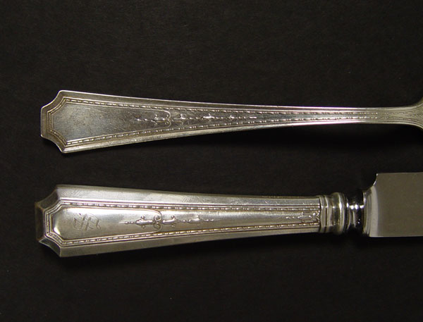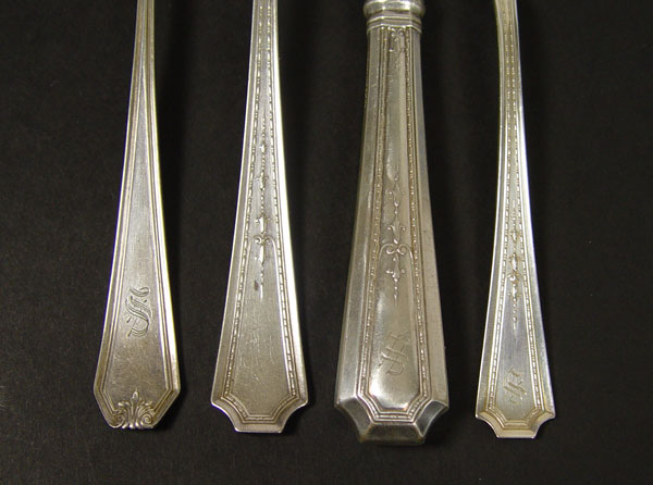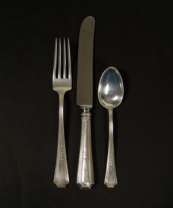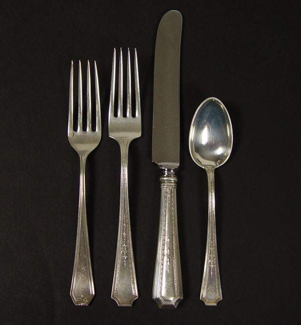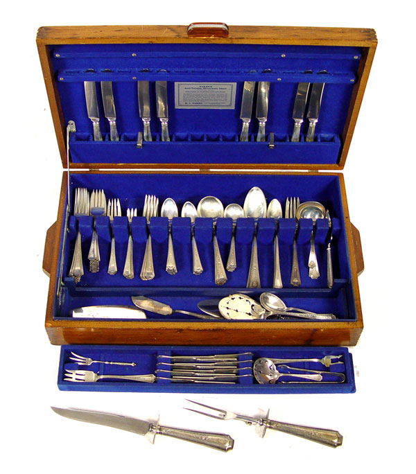 DURGIN COLFAX STERLING FLATWARE SERVICE FOR 8: Approx. 98 pieces in the Colfax pattern by Durgin to include 8 forks (7 1/8''), 12 salad forks ((6 1/8''), 2 fish forks (6 1/4''), 8 cocktail forks (5 1/2''), 16 teaspoons (5 3/4''), 8 soup spoons (5 1/4''), 8 iced tea spoons (7 3/4''), 6 gumbo spoons (6 3/4''), 8 hollow knives (8 1/2''), master butter (6 3/4''), 8 solid butter knives (5 1/2''), serving fork (7 1/2''), cream ladle (5''), gravy ladle (6''), pickle fork (5 1/8''), small serving fork (6''), small pierced spoon (4 3/4''), sugar tongs (4 1/2''), sugar scoop (6''), pie server (6 1/2''), cake server (10''), pierced tomato server 8 1/2'', carving set (fork 10 1/2'', knife 12''). Set is sold with 6 forks from Whiting (6 3/4''), Gorham lemon fork (4 1/2'') and unknown maker cake server (10 1/4''). Sold with silver chest 4 1/4'' x 23'' x 13 3/4''. Most pieces monogrammed. Approx. 99.7 troy oz.