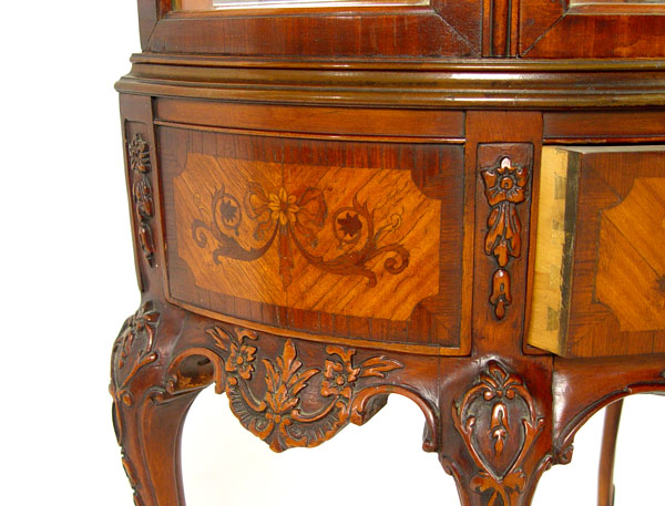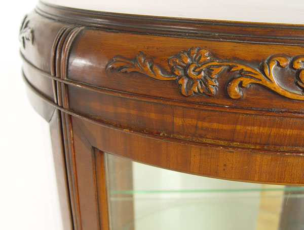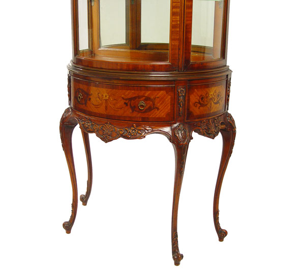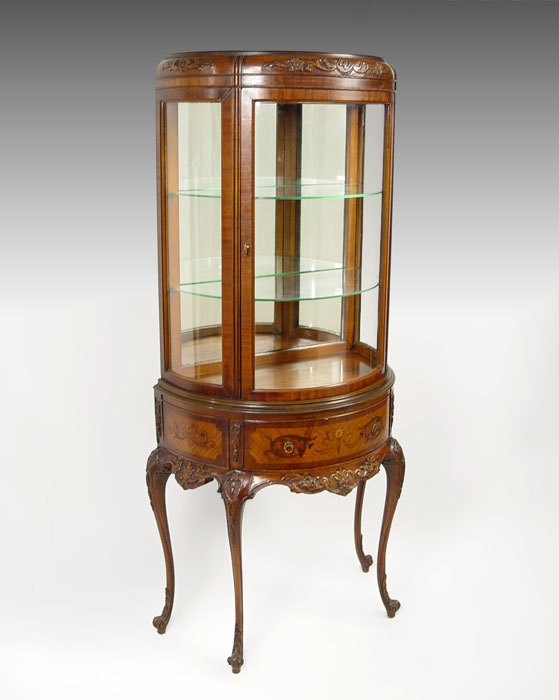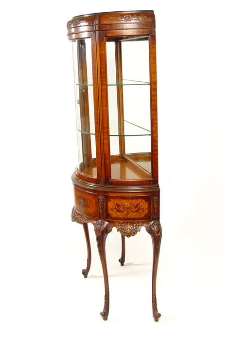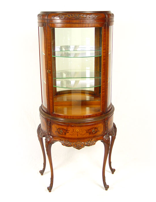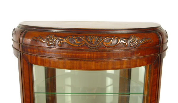 WEIMAN FRENCH STYLE DEMI LUNE VITRINE CURIO DISPLAY: Half round glass door, interior with mirrored back and 2 adjustable interior shelves. Base with carved apron and legs, inlaid veneer drawer front and sides. Fitted with interior light. 59 1/2'' tall, 29'' wide, 15'' deep,