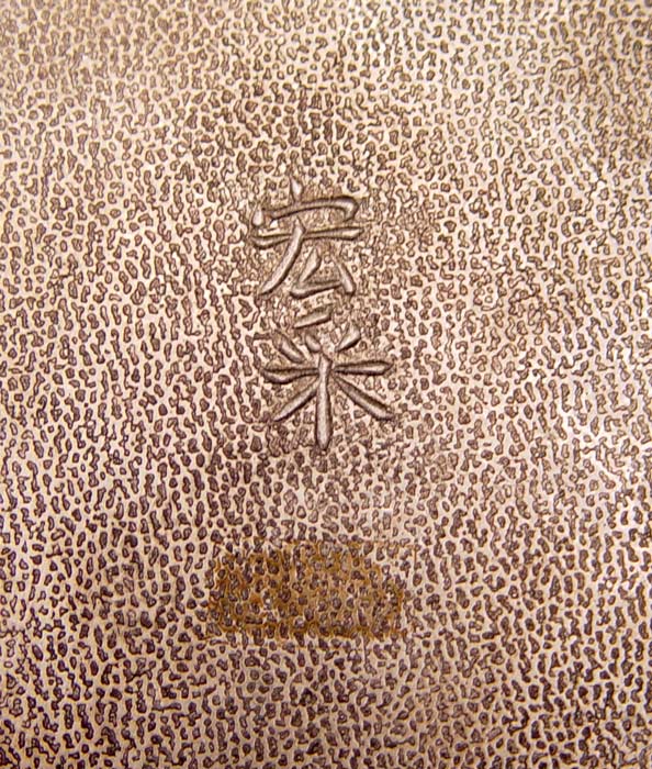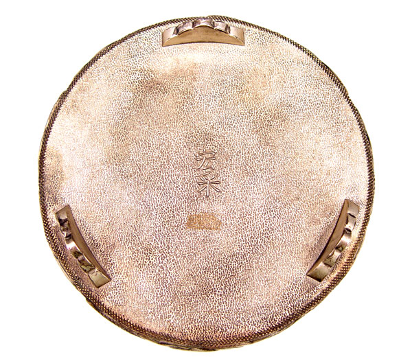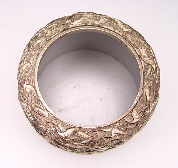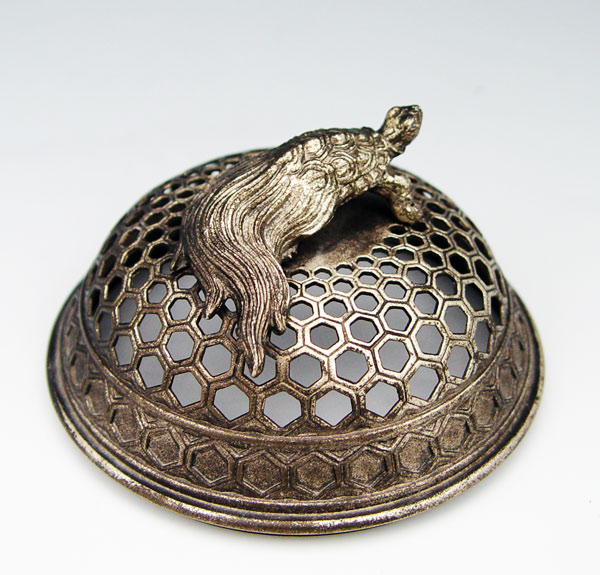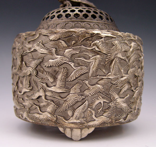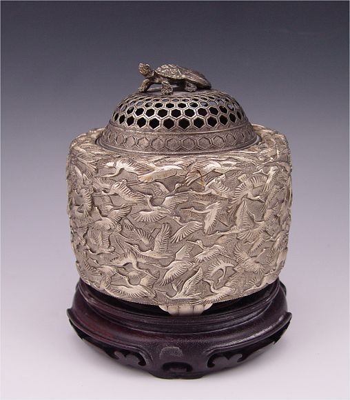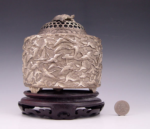 SIGNED JAPANESE THOUSAND CRANE COVERED JAR: Reticulated lid surmounted by a the turtle of longevity, Silver washed metal. 5''. Accompanied by the wood stand.