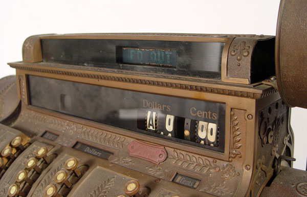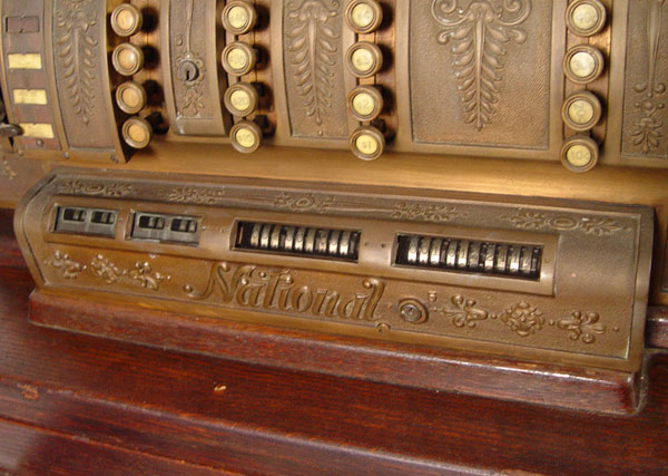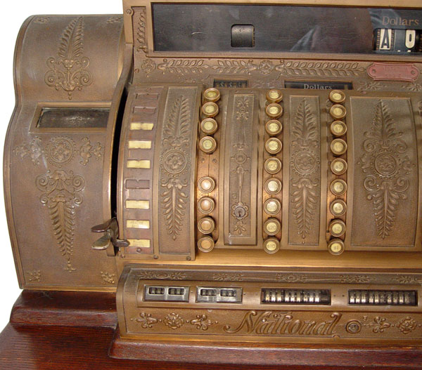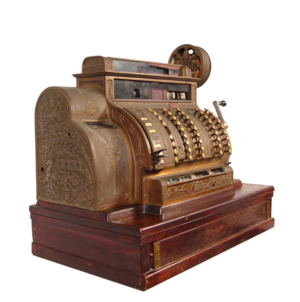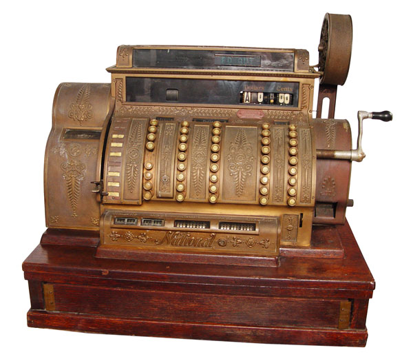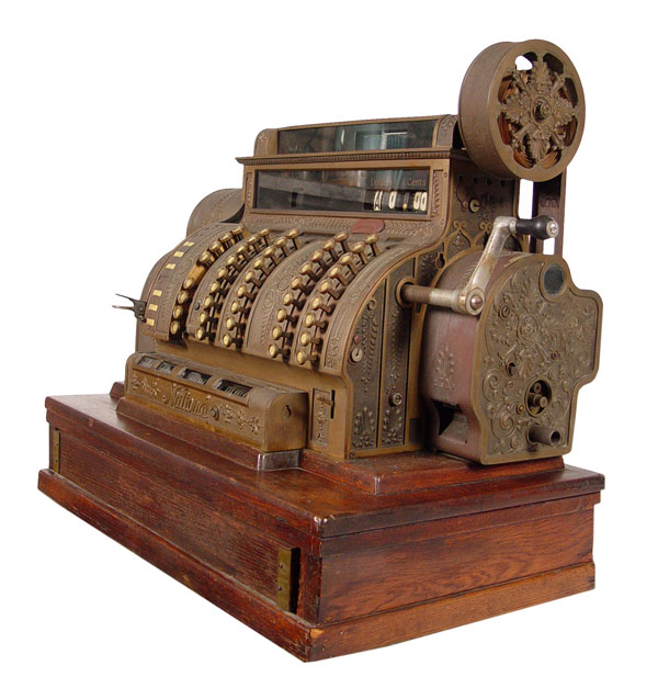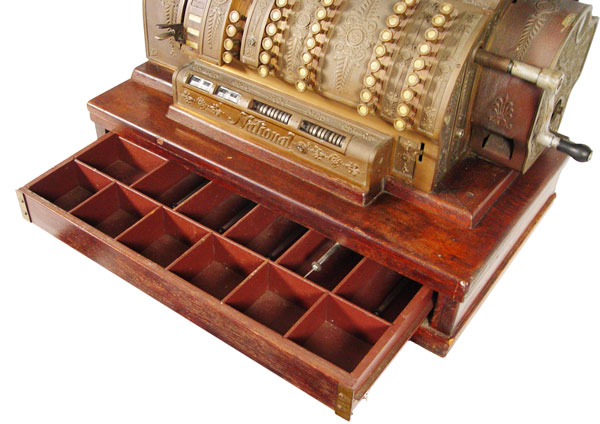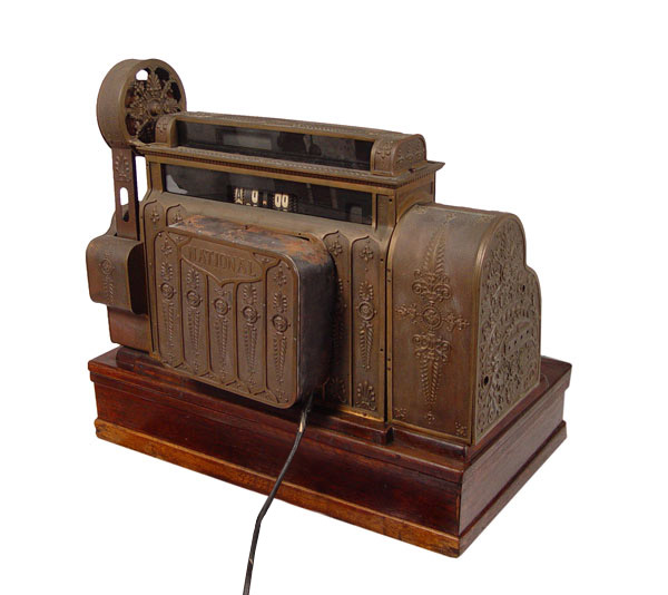 NATIONAL CASH REGISTER 592: Serial number S1532278M. Single drawer oak cash drawer. Brass Empire style boy with crank. Powered by electricity. Measures 26 1/2'' h. x 29'' x 19''.