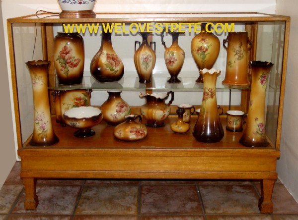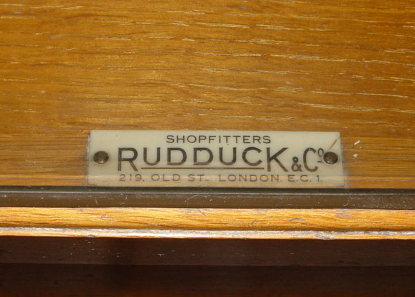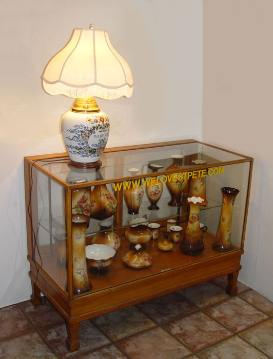 VINTAGE RUDDICK OAK COUNTRY STORE DISPLAY CASE: Wood framing with glass sides, top and sliding doors, raised on wood legs, 35 3/4'' h. x 46 1/2'' x 22 1/2''