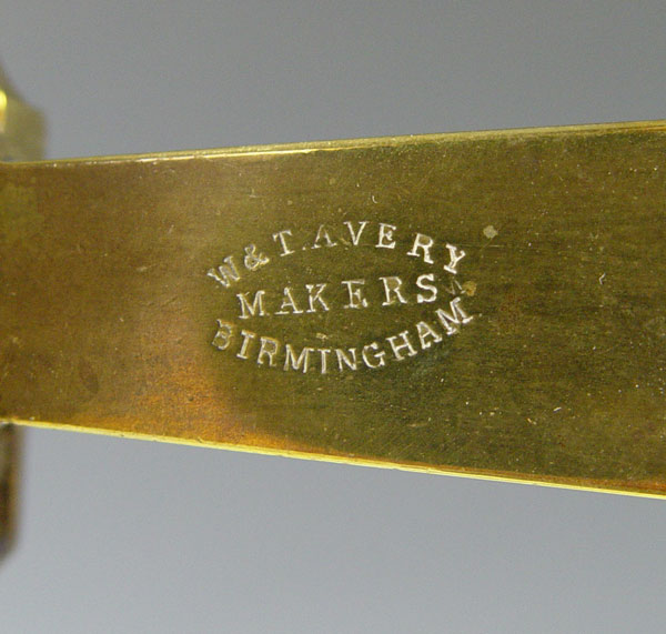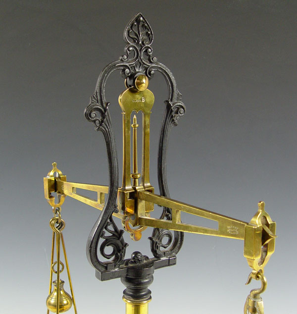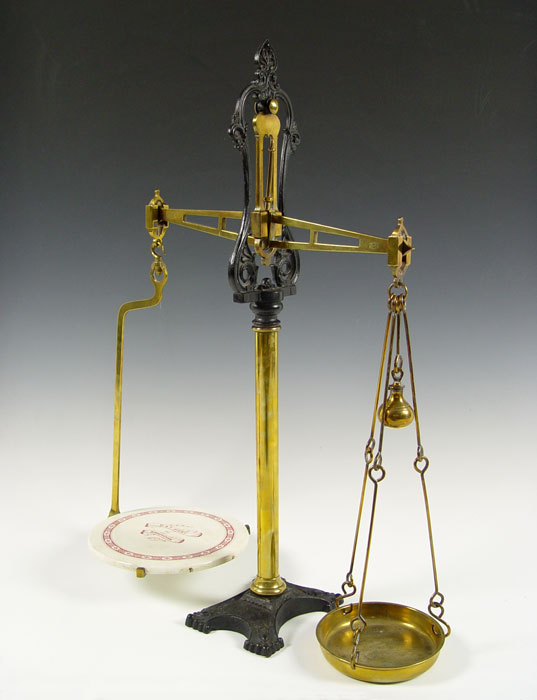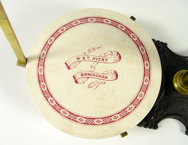 W & T AVERY ENGLISH BALANCE SCALE: Marked on porcelain base, arm, patent number 31364 on arm. Brass construction. No weights. Measures 19'' h. x 10 1/2'' base dia.