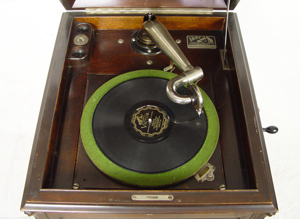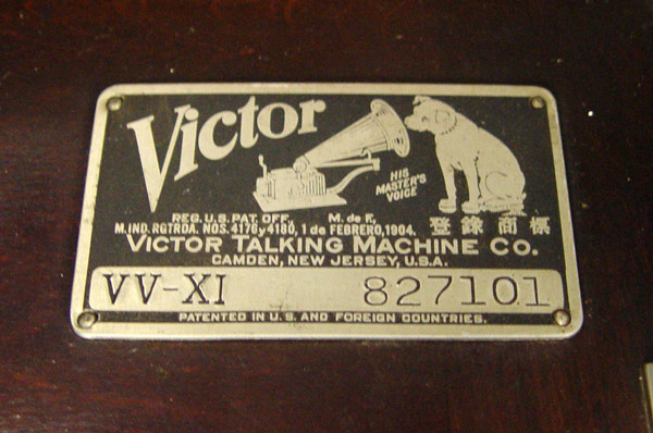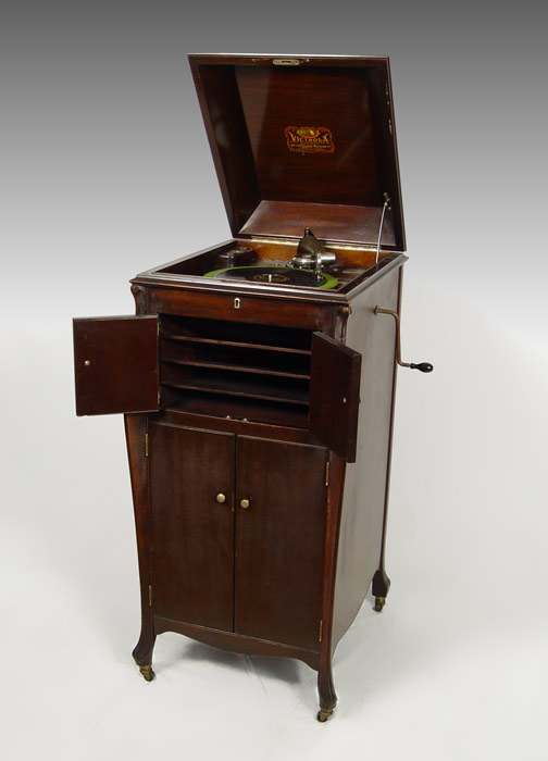 1914 VICTOR VICTROLA VV XI WITH RECORDS: Floor model mahogany veneer cabinet with lift top. S door sheet music cabinet over 2 door record shelves with records. Complete with extra needles, brush, and crank. Serial number 82710, dates to 1914. Key available in office. Measures 43'' h. x 20'' x 22''.