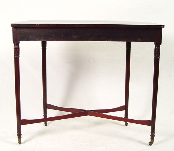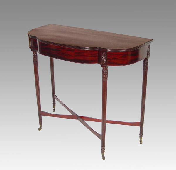 SHERATON DEMI LUNE TABLE: Sheraton mahogany demilune table, refinished, fine tapered and reeded leg, brass caps and casters with cross stretchers. 41'' wide, 20'' deep, 36'' tall.
