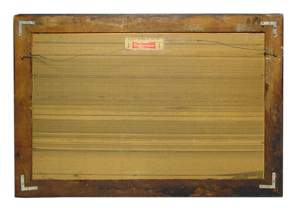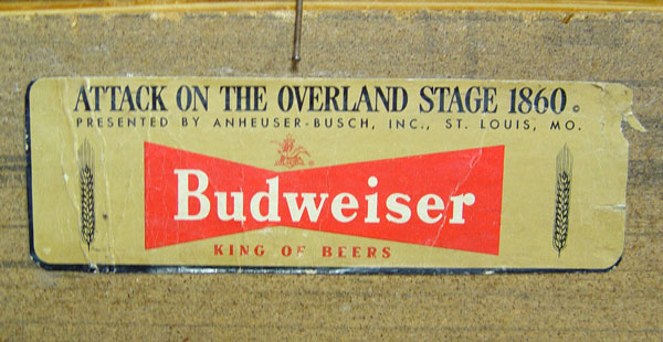 LARGE BUDWEISER OVERLAND STAGECOACH ADVERTISING PRINT: Print titled ''Attach on the Overland Stagecoach 1860'' with Budweiser emblem verso. Sight size 23 1/2'' x 37''. Framed 30'' x 43 1/2''.