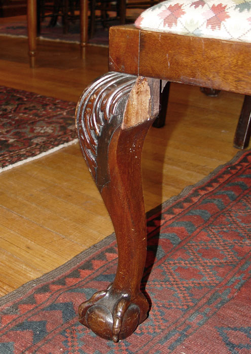 SET OF 8 MAHOGANY BALL AND CLAW FOOT CHIPPENDALE STYLE DINING CHAIRS: 2 arm chairs, 6 side chairs, mid to late 20th C. Please note gently used condition. 39 1/2''h. x 23''w. x 21''d.