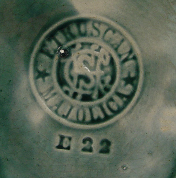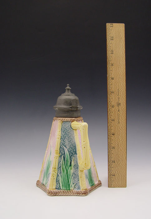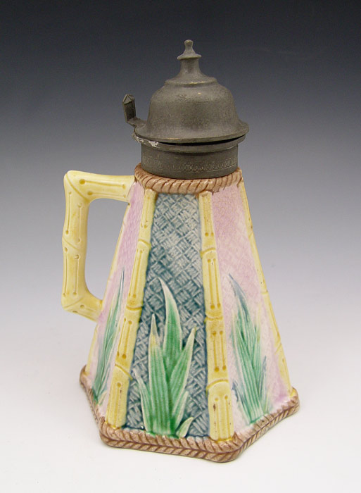 GRIFFIN, SMITH AND HILL MAJOLICA SYRUP PITCHER: Ca. 1879-1892, Phoenixville, Pennsylvania. 8'' tall including the hinged pewter lid. Well marked with the Etruscan logo mark.