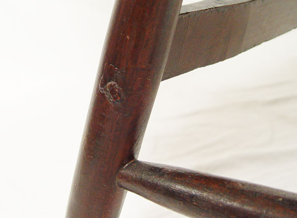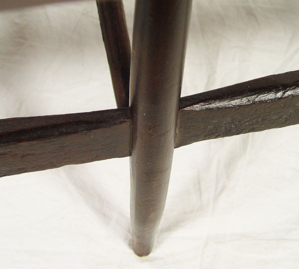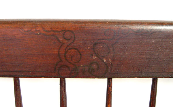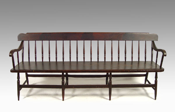 AMERICAN COUNTRY SHERATON PAINT DECORATED SETTLE: 18 Spindle back with flame mahogany paint design on back support, pinstriped painted seat, turned legs with stretchers. 78'' wide, 21'' deep, 32 1/2'' tall