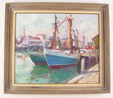 GRUPPE, Emile, (American, 1896-1978): Gloucester Dockside Scene, OIL/Canvas, 25'' x 30'', signed, distressed period frame, 31 1/2'' x 35 1/2'', titled verso.