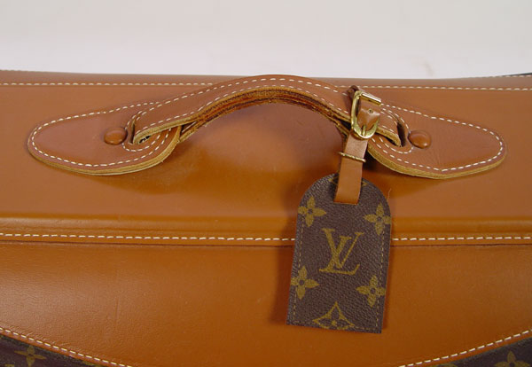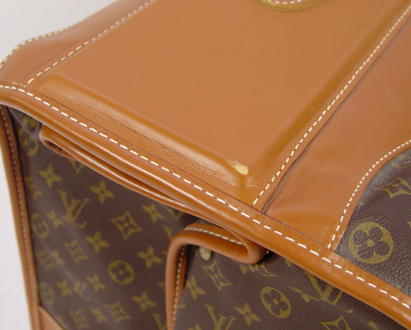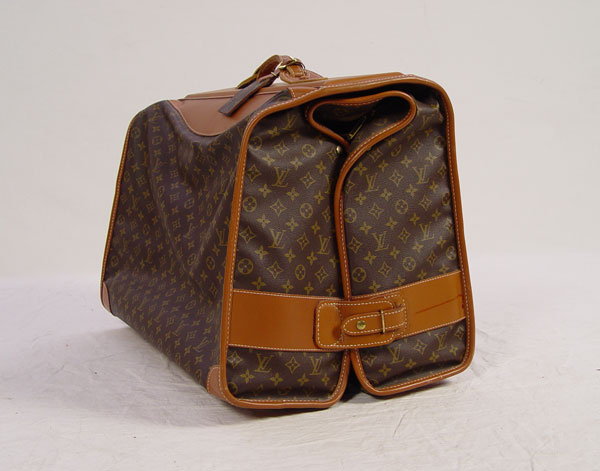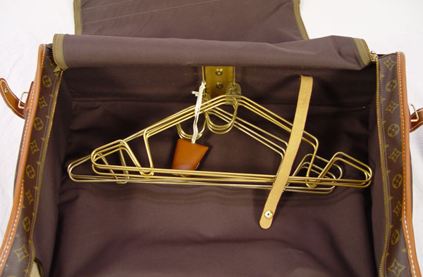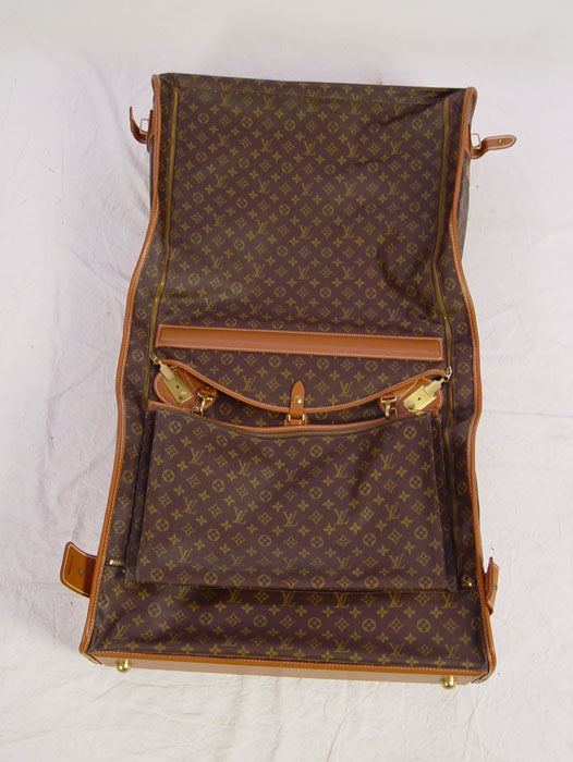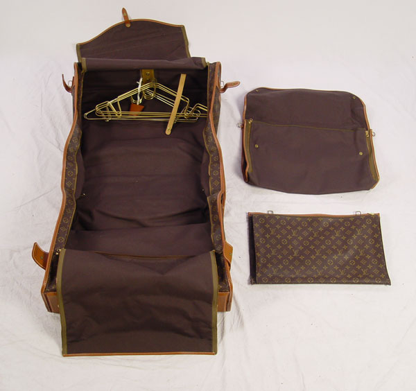 LOUIS VUITTON GARMENT BAG: Classic logo decoration. Folds to carry as a satchel. hook for hanging. 41'' long x 8'' deep. Purchased directly from Vuitton store; virtually unused!