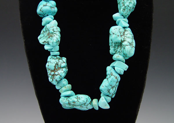 LARGE TURQUOISE NUGGET NECKLACE: Trios of small turquoise nuggets spaced between 2 large nuggets. The large turquoise are 100rox. 1-1.5'' dia. 19'' length.