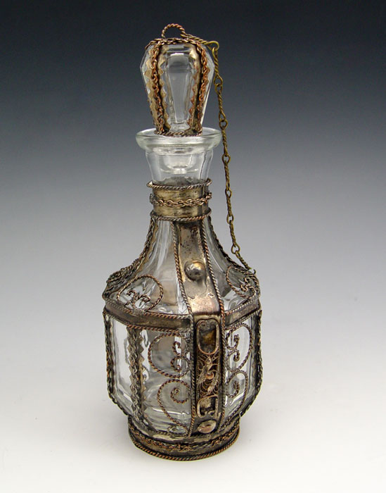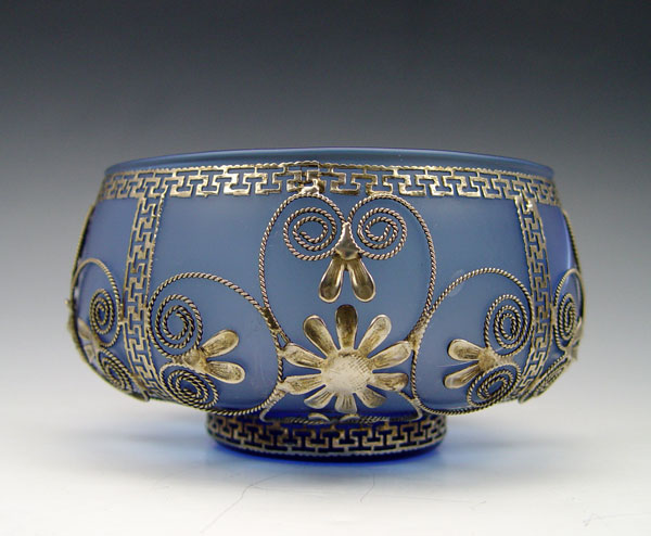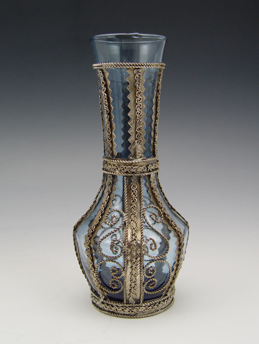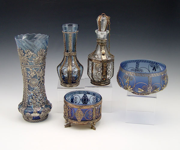 5 METAL MOUNTED GLASS VASES: Cast metal mountings over blue glass, assorted sizes and shapes to include - vase 8 3/4''h. and bowl 3'' x 5 1/4''dia.
