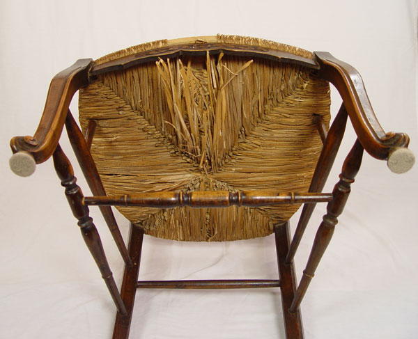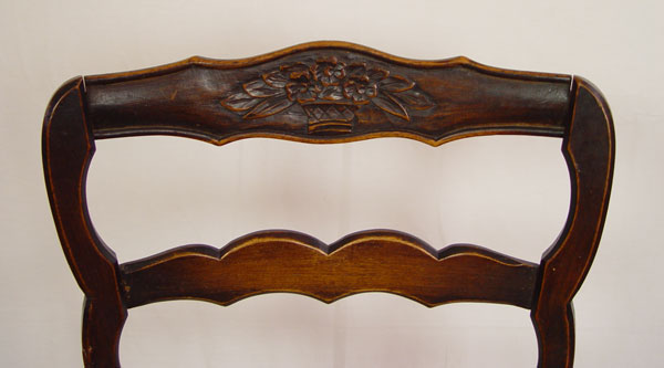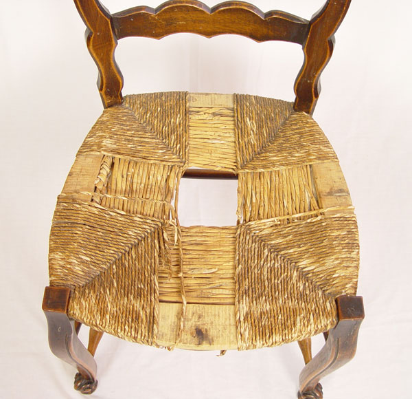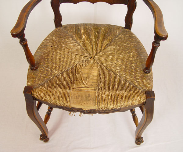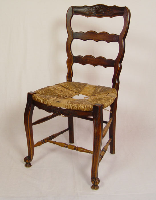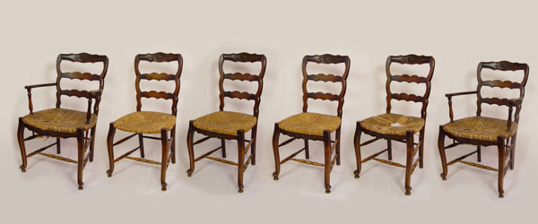 SET OF 6 COUNTRY FRENCH CHAIRS: Country French slat back chairs. 4 straight and 2 carved back arm chairs with rush woven seats, French foot with stretcher, 23'' wide, 24'' deep, 37'' tall