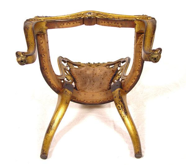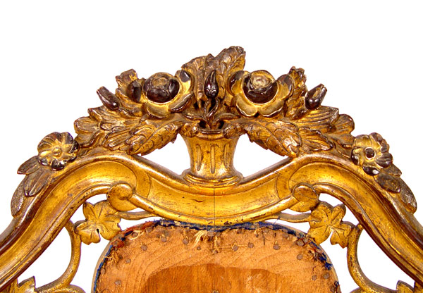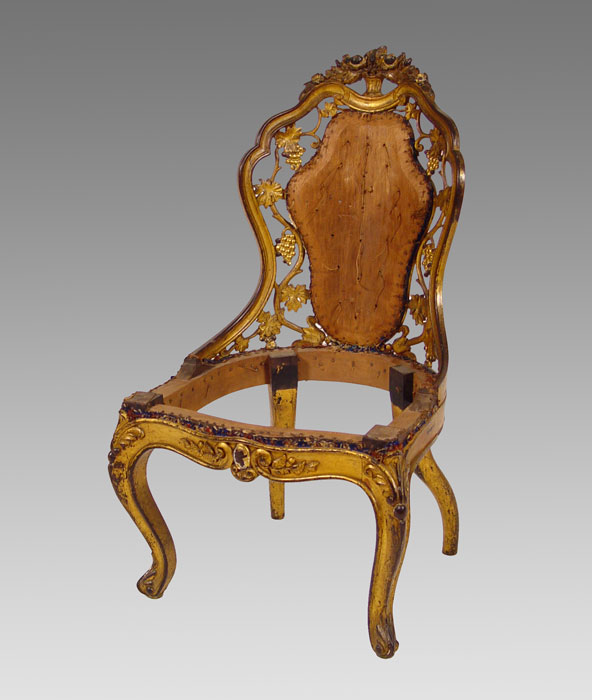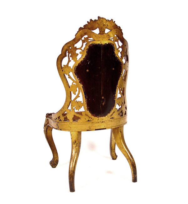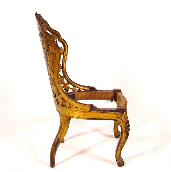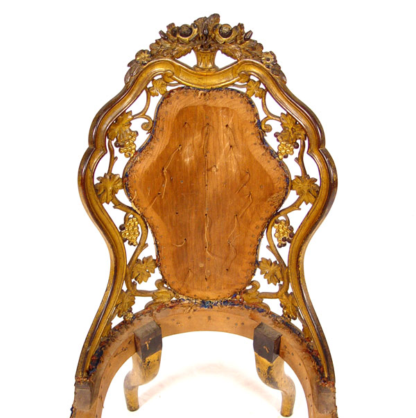 19th C BELTER QUALITY LAMINATED CARVED PARTIAL GILT CHAIR: Early 19th century carved, 5-6 layer laminated and gilded lady's chair. Armless chair with richly carved back with open cut grapevine design, topped with carved floral basket and finished with a rubbed gilded patina front and back. Center back and seat need to be upholstered. Note: Missing front casters only. 19 1/2'' wide, 20'' deep, 35 1/2'' tall