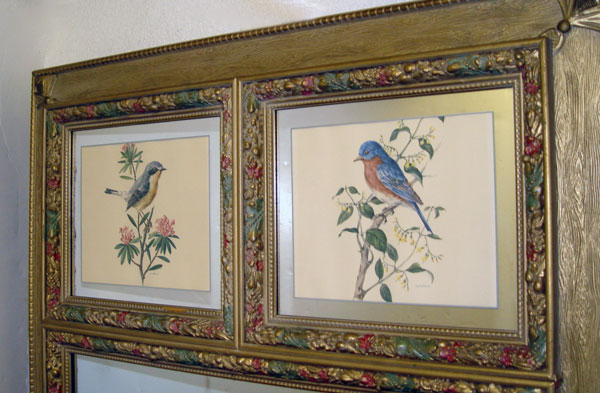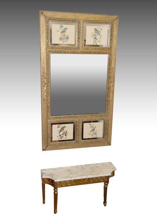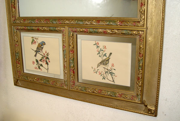 LATE VICTORIAN DECORATIVE PANELED MIRROR: Carved outer frame with wood grain design. Large central mirror edged in hand colored carved molding. 2 panels at top and bottom featuring colored prints of birds and flowers edged in mirror and carved moldings. 62'' h x 34 1/2'' x 2''