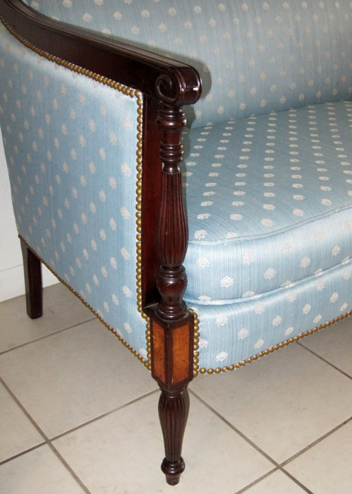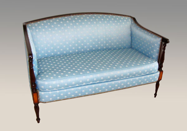 HICKORY CHAIR CO. SHERATON STYLE LOVESEAT: Polished wood frame with rolled arm, reeded front over inlaid block continued to tapered reeded leg. Nicely upholstered in blue brocade fabric with white shell design and trimmed in brass studs. Approx. 52'' wide, 29'' deep, 31'' tall.